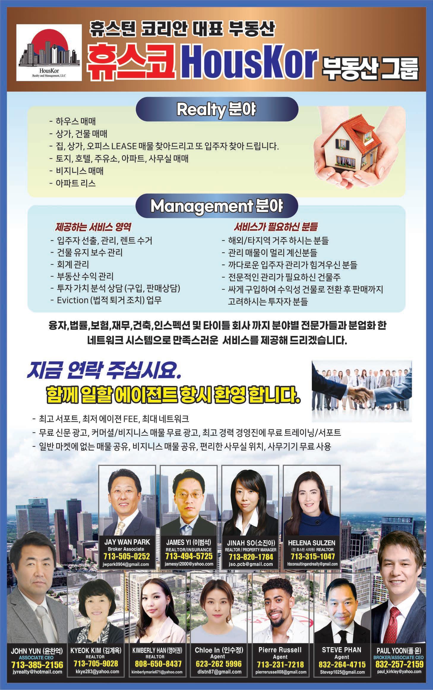베트남참전국가유공자전우회(문박부) (832)482-5748 해병대전우회(이광우) --- (281)451-8297 휴스턴해군동지회(윤영구)---(713)294-2310 6.25참전국가유공자회 ----- (832)326-4620 특전전우회------------- (832)876-8111 휴스턴체육회(유유리)------ (832)274-6138 휴스턴골프협회(이세홍)