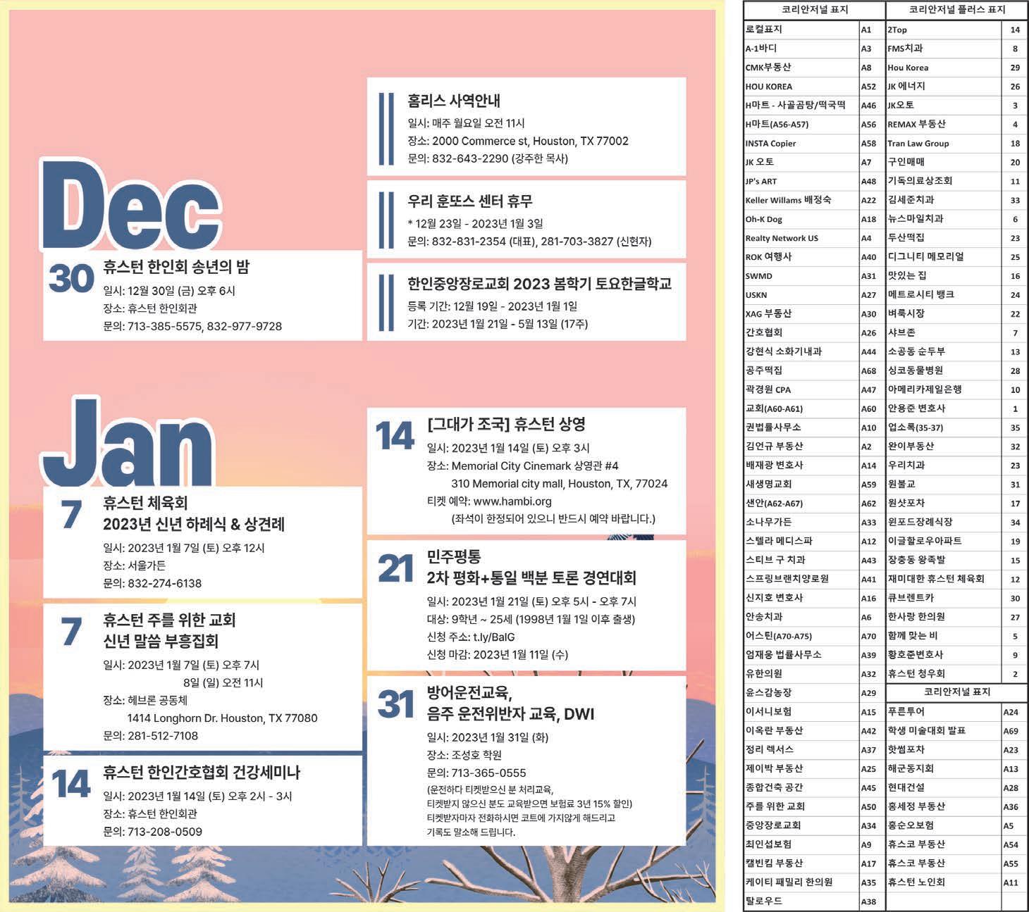 광고안내표 재미한인의학협회남서부지부 ----- (713)861-8188 한미에너지석유기술협회-------- (713)301-2020 한미석유가스엔지니어협회 (정철균) ---------- 휴스턴총영사관(안명수) --- (713)961-0186 민주평통휴스턴(박요한) --- (832)919-4404 한국교육원(양은미)------ (713)961-4104 향군미중남부지회(정태환)-- (832)326-4620 재미남서부미술가협회 ------- (713)885-7119 화요수채화(이병선) -------(832)483-7979 한얼 국악단(양진석)-------- (713)894-1425 농악단/한나래(허현숙) ------