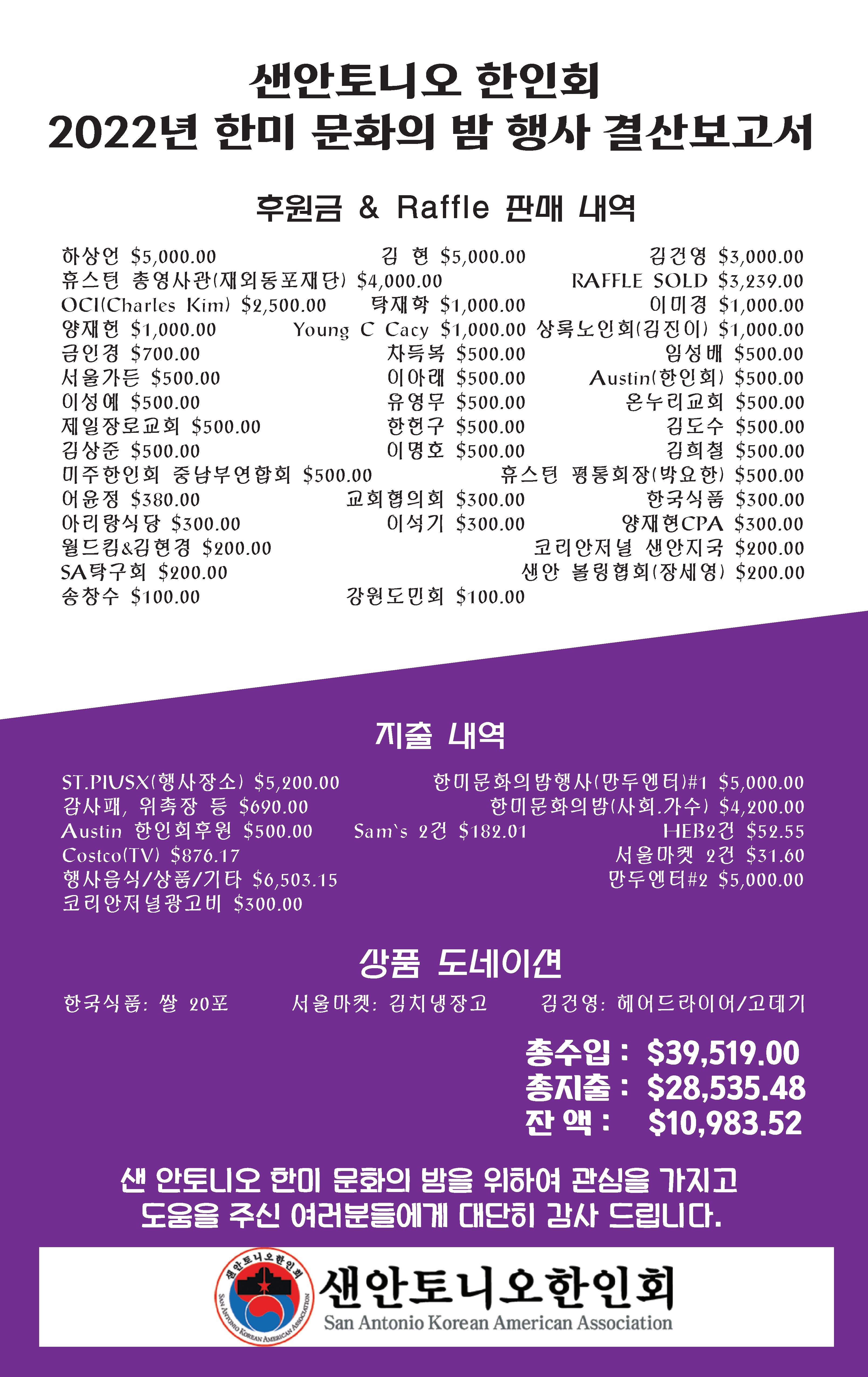 동문들을 만나게 되어 반 갑다”고 인사말을 전했다. 구자동 회장은 동창회가 지난 3년 동안 한 일이 없다고 보고하면서도, “장학 사업 만큼은 3년 내내 장학위원회 (위원장 최인숙)를 중심으로 코로 나 팬데믹 중에도 장학생 선발 및 장학금 지원을 계속 했다.”고 말했 다. 별도의 장학금 수여식은 생략 했지만 올해도 총11명의 장학생을 선발해 각 1천 달러의 장학금을 전 달했다. 또 2023년부터는 1인당 1 천 500달러로 장학금도 증액키로 결정했다고 발표했다.