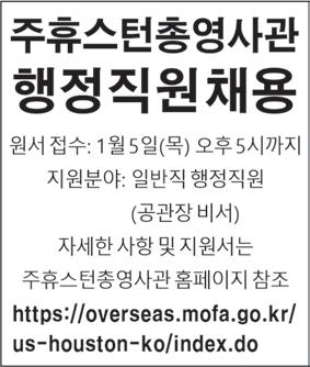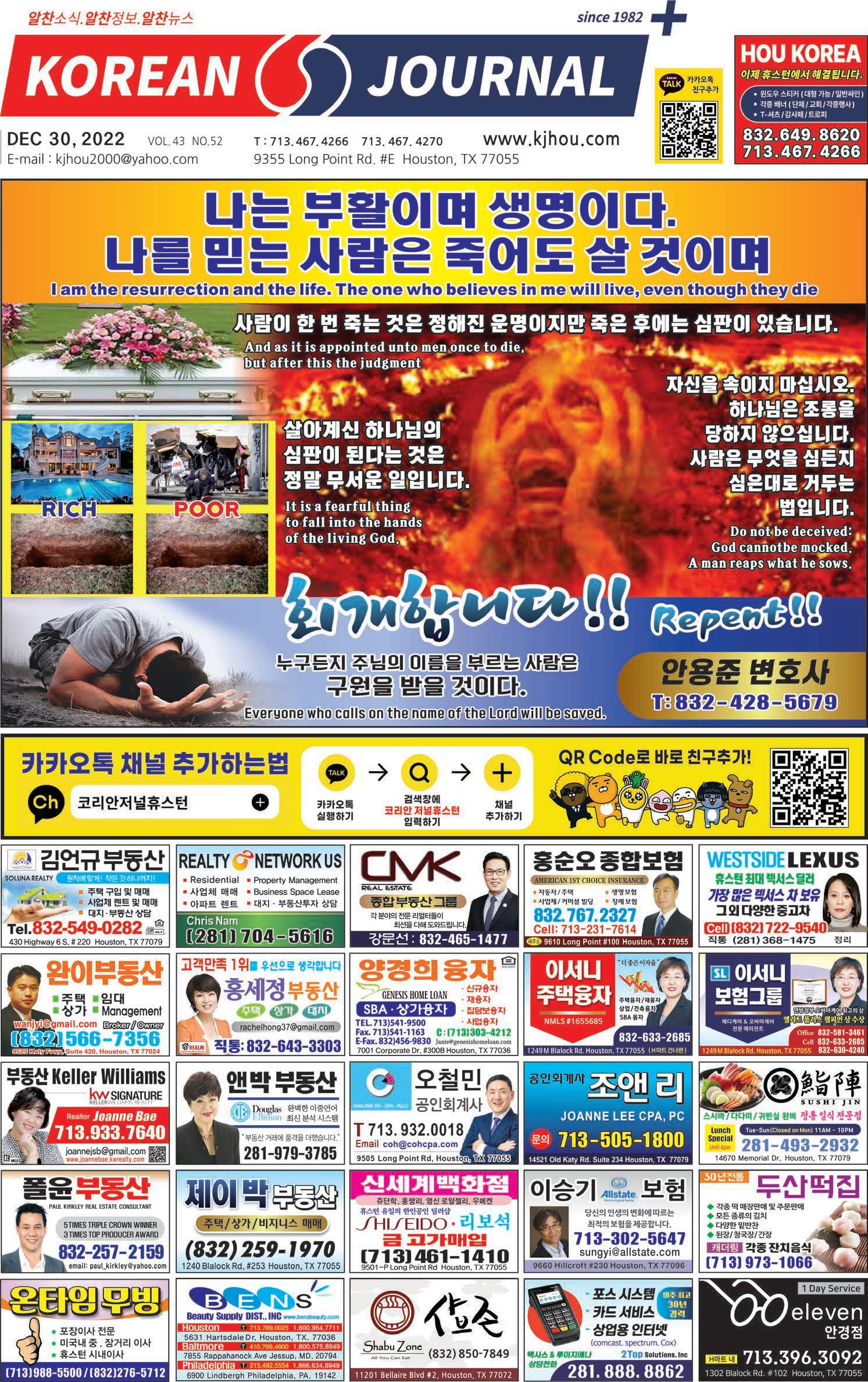 메모리얼, 묘지팝니다. -------------------------(832)741-2055 DEC 30, 2022 22 결코 만만치 않았던 올 한 해의 끝자락에 섰다. 어제보다는 좀더 정의롭고 공정한 이야기들로 내일이 만들어 지길 희망해 본다. 아듀! 2022