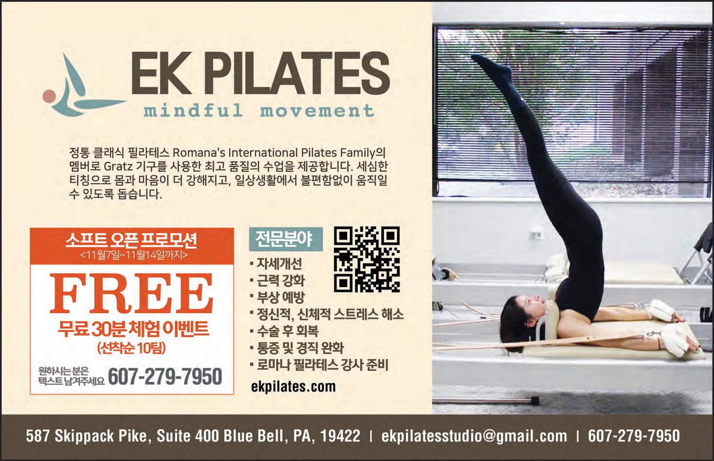 테스는 한 세션 안에서 전신이 동시에 작동하도록 설계돼 있다. 즉 코어(복횡 근·다열근·횡경막·골반기저근)를 먼저 깨우고, 그 힘으로 팔다리를 움직이게 하는 구조다. 이 때문에 클래식 필라 테스는 허리나 골반 주변이 약한 사람, 오래 앉아 있는 직장인, 산후 회복 단 계에 있는 사람, 시니어처럼 관절 부담 이 큰 이들에게 특히 유용하다는 평가 를 받는다. 한 대표는 “척추를 지지하 는 근육이 단단해질수록 통증 부담이 줄고, 앉기·서기·걷기 같은 가장 기본적 인 동작이 편해지는 것이 클래식 필라 테스의 궁극적인 목표”라고 덧붙였다. PA최초 한인 필라테스, 1:1및2:1, 3:1 그룹레슨까지 솔 클래식 필라테스는 ‘프라이빗함’과 ‘ 정확한 피드백’을 중심으로 설계된 스 튜디오다. 한소라 대표는 “필라테스는 개인의 컨디션, 유연성, 통증 정도에 따 라 지도 방식이 달라져야 한다”고 말했 다. 따라서 대형 그룹보다는 소수 정예 로 세밀하게 지도하는 것이 훨씬 효과 적이라는 것이 그의 설명이다. 스튜디오는 ▲1:1 개인레슨,