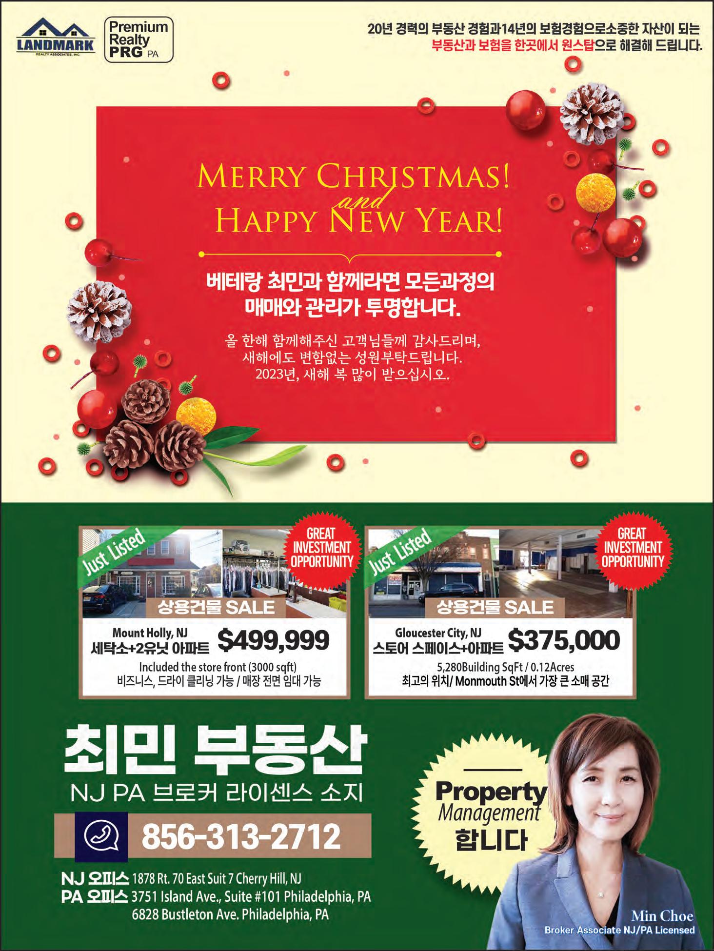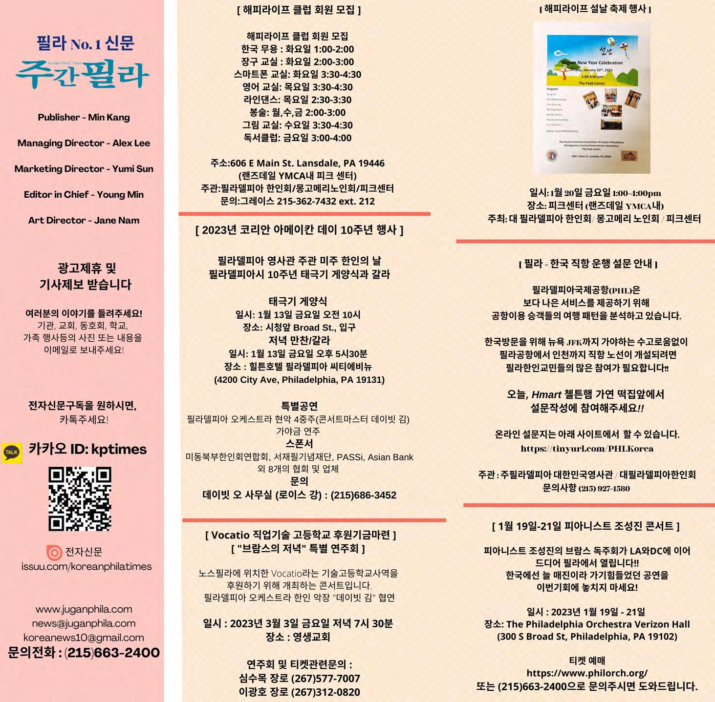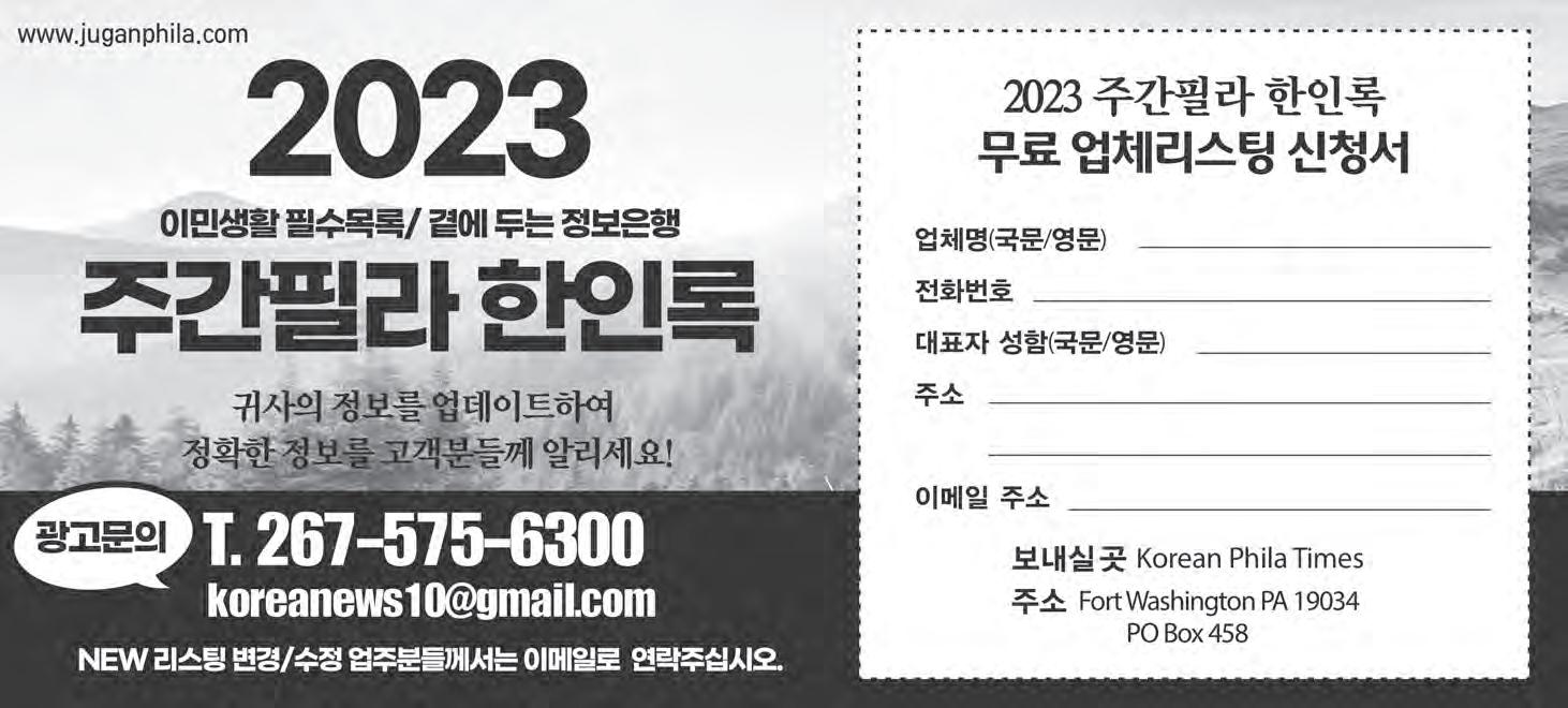 663-2400)으로 직접 연락주기 바란다. 마지막으로, 2023년 주간필라 한인록을 위해 많은 관심을 가져주신 독자분들과 아낌없는 지원을 해주신 광고주분들에