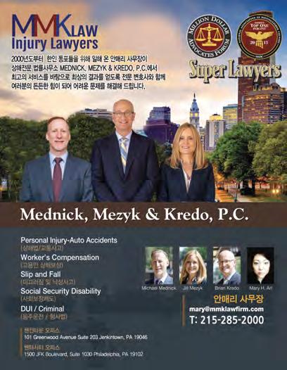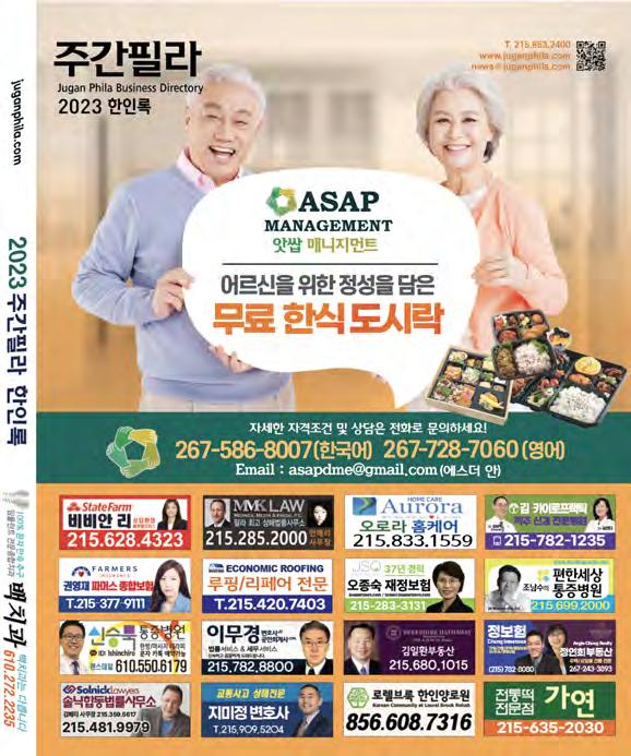 노력을 기울였 다. 업소들의 정확한 리 스팅을 위해 주간필라 편집팀은 작년 여 름부터 각 업체마다 연락하여 업데이트 를 시작하였고, 그 노력의 결과 2023년 한인록이 탄생하게 되었다. 또한 모든 페 이지가 컬라로 제작되어 이용자들의 편 리를 우선으로 하였다. 올해 한인 록 메 인 표지는 작년에 이어 “아쌉 매니지먼 트의 무료 한식도시락” 광고가 자리잡았 고, 뒷면은 2000년도부터 한인동포들을 위해 일해 온 안 매리 사무장의 MMK 법 률회사가 장식하였다. 특히, 이번 2023년도 한인록은 디지털화 에 맞추어 온라인 버전을 함께 출시하여, 타지역 / 타주 심지어 한국에서도 우리 필라한인사회 업소록과 정보를 공유할 수 있도록 한 데에 큰 의미가 있다.
