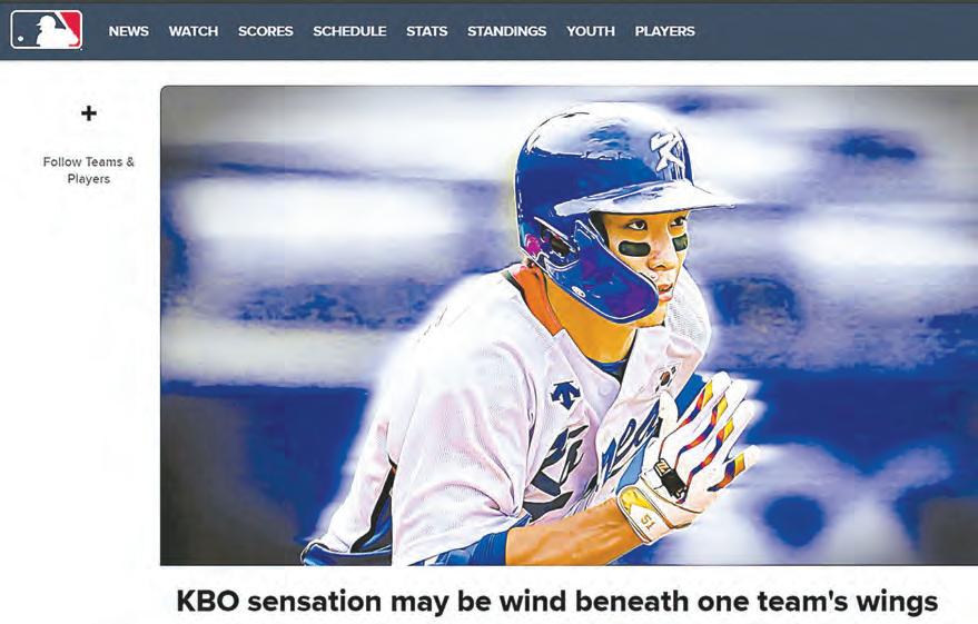THE KOREA TIMES DAILY A11 Wednesday, December 21, 2022 2022년 12월 21일 (수) 스포츠 빅리그 진출을 공식화한 이정후(24·키움)가 20일 메이저리그 공식 홈페이지 MLB닷컴 대 문을 장식했다. 키움 구단에 미국 도전 의사를 내비친 지 하루 만에 이뤄진 미국 현지의 집중 조명이다. 메이저리그에서 뛸 수 있는 2년 뒤 에도 26세에 불과하고, 한국프로야구(KBO리 그)를 평정한 천재적인 타격 실력을 갖췄기에 가능한 일이다. 내년 시즌에도 올해 못지않은 활약을 이어간다면 김하성(샌디에이고), 류현 진(토론토)을 넘어 한국인 역대 최고 대우로 태 평양을 건널 것으로 보인다. 이정후는 두말할 필요 없는 KBO리그 최고 타자다. 2017년 데뷔해 신인왕을 차지하고 6년 연속 3할 타율을 기록했다. 3,000타석 이상 소 화한 타자 가운데 통산 타율은 0.342로 1위다. 매 시즌 정체되지 않고 성장한 모습을 보여 올 해에는 타격 5관왕(타율·타점·안타·출루율· 장타율)을 차지하고 정규시즌 최우수선수상 (MVP)도 받았다. 태극마크를 달고도 2018 아 시안게임, 2019 프리미어12, 2022 도쿄올림픽 등에서 꾸준히 활약했다. 빅리그 구단이 군침을 안 흘리는 게 이상할 정도다. 관건은 이정후의 몸값이다. 이정후는 2023시즌을 소화하면 1군 등록일수 7년을 모 두 채워 포스팅 시스템(비공개 경쟁입찰)을 통 해 메이저리그 문을 두드릴 수 있다. 구단의 동의 가 필요하지만 키움은 강정호 박병호(KT) 김하 성 사례처럼 대승적으로 허락할 가능성이 높다. KBO리그 출신 빅리거들은 다수가 포스팅 시스템으로 미국 땅을 밟았다. 자유계약선수 (FA)와 포스팅 시스템을 통틀어 최고 대우를 받 고 간 선수는 2013년 류현진과 2021년 김하성 이다. 류현진은 6년 보장에 3,600만 달러에 LA