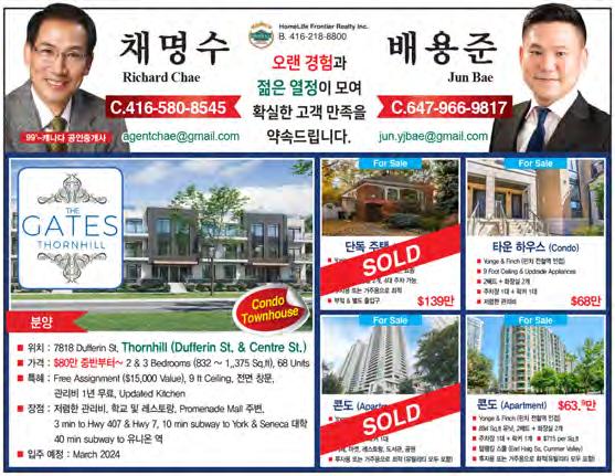 B20 Wednesday, December 21, 2022 2022년 12월 21일 (수) 핫리스팅 Homelife Frontier Realty Inc. 7620 Yonge St. #400, 416-218-8800 416.659.4380 realtorjhl@gmail.com 이준호 Broker Convenience $139,000 ● 교외 50분 쾌적한 환경의 소도시 Downtown ● 높은 마진과 손쉬운 경영 ● Size: 1,152 sq. ● Rent: $1,567(inc. TMI) + HST/M until Sept. 2023 $1,638(inc. TMI) + HST/M until Sept. 2028 ● Sales: $9,000 / W (담배 60% - Margin12%, 담배이외 평균 Margin 40%이상) ● Lotto 수입: $3,500 /M ● ATM, Nevada etc.: $500 / M ● Net Profit: $10,000이상 / M 단독주택 렌트 $4,700 ● Thornhill Woods에 위치한 2층 단독주택 ● 4베드룸 + 4 화장실 ● Finished & Walk-Out Basement ● 2 Car Garage + 4 Car Parking Driveway ● Fully renovated Bathroom, New Hardwood Floor ● Brand New Top Line Kitchen Appliances SOLD COND. SOLD COND. Leased Leased 19년여의 성공적인 토론토 부동산 투자 19년여의 한국감정원 근무 평생 외길 부동산 22년 배상우 SANGWOO BAE Realtor®Broker 배명직 MYUNG JIK BAE Realtor®Broker 647-223-9090 RIGHT AT HOME REALTY INC. BROKERAGE 1396 Don Mills Rd. #B121 Toronto, ON. TEL: 416-391-3232, FAX: 416-391-0319 647-400-9090 Area ; 2 beds (610 sq ft) + 1 parking View ; South East 9 ft ceilingGourmet kitchen Open Concept 32층 Leased www.koreatimes.net