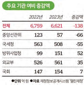 B2 Wednesday, January 25, 2023 2023년 1월 25일 (수) 윤석열 정부 들어 행정·입법·사법부 기관 3곳 중 1곳은 출장비 성격의 여비를 전년 대 비 늘린 것으로 확인됐다. 긴축 기조를 앞세 워 정부 운영에 필요한 경상경비는 아끼겠다 고 한 윤석열 정부 방침을 역주행한 셈이다. 한국일보가 24일 재정정보공개시스템‘열린 재정’을 통해 지난해 말 국회를 통과한 58개 정부 기관 여비를 분석한 결과다. 여비, 국내 229억 감소·국외 91억 증가 정부 부처 및 각종 위원회 54개와 국회, 대 법원, 헌법재판소, 중앙선거관리위원회 등 총 58개 정부 기관이 배정받은 올해 여비는 6,621억 원으로 전년 대비 138억 원(-2.03%) 감소했다. 국내여비가 4,314억 원으로 229억 원 줄어든 반면 해외 출장비를 뜻하는 국외 업무여비, 국외교육여비는 각각 1,713억 원, 594억 원으로 69억 원과 22억 원이 늘었다. 2020년 7,173억 원이었던 전체 여비는 2021년 6,888억 원, 2022년 6,759억 원에 이어 올해까지 3년 연속 축소했다. 코로나 19 시기 상승세를 탄 여비 삭감 기류는 거 리 두기가 풀린 윤석열 정부에서도 이어지 고 있다. 건전 재정 차원에서 업무추진비, 운영비 등 경상경비를 줄인다는 나랏돈 운 용 지침 때문이다. 기획재정부 관계자는“국내여비는