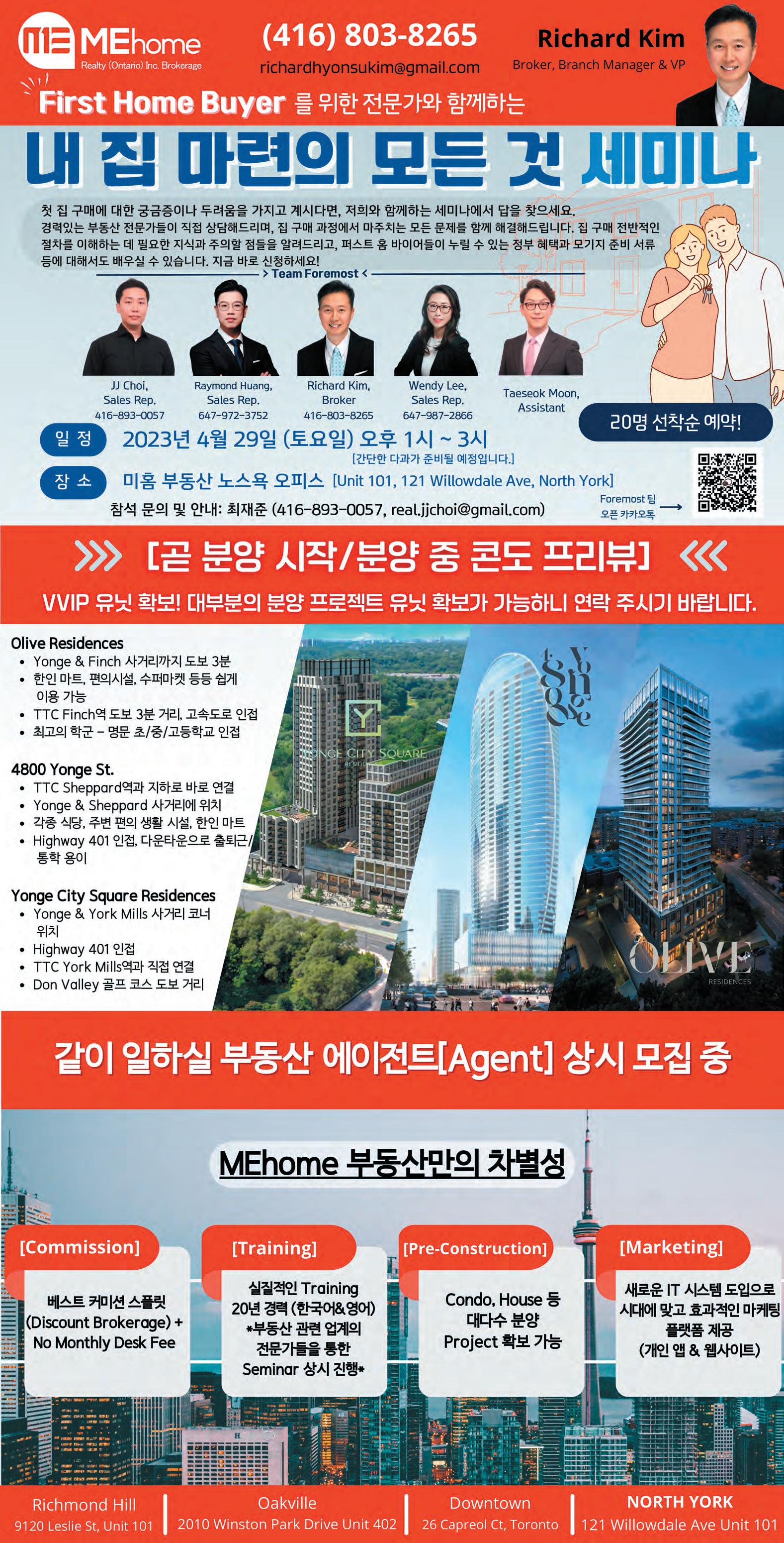 B16 Wednesday, April 5, 2023 2023년 4월 5일 (수) 핫리스팅 북부2.5시간 컨비 2020 TOP #1 AGENT IN 2020 www.koreatimes.net 신문처럼 봅니다 Home Standards Brickstone Realty, Brokerage 180 Steeles Ave W Unit 30, Thornhill, ON L4J 2L1 Office: (905) 771-0885 Fax: (905) 771-0873 밝고, 리노베이션된 완벽한 레이아웃, 탁트인 전망 $1,188,000 $4,150 2배드룸 1 파킹포함, 다이렉트 전철역 연결 5월10일 입주가능 영/에글링턴 1 Jr 베드룸 5월1일 입주 가능 영/에글링턴 Homelife Frontier Realty Inc. 7620 Yonge St. #400, 416-218-8800 416.659.4380 realtorjhl@gmail.com 이준호 Broker Convenience $139,000 ● 교외 50분 쾌적한 환경의 소도시 Downtown ● 높은 마진과 손쉬운 경영 ● Size: 1,152 sq. ● Rent: $1,567(inc. TMI) + HST/M until Sept. 2023 $1,638(inc. TMI) + HST/M until Sept. 2028 담배이외 평균 Margin 40%이상) 단독주택 렌트 $4,700 ● Thornhill Woods에 위치한 2층 단독주택 ● 4베드룸 + 4 화장실 ● Finished & Walk-Out Basement ● 2 Car Garage + 4 Car Parking Driveway ● Fully renovated Bathroom, New Hardwood Floor ● Brand New Top Line Kitchen Appliances Leased Leased SOLD SOLD 언론계 24년, 패스트푸드 프랜차이즈, 편의점 등 16년 운영 David Kee Sales Rep. 기원탁 647.501.9990 가격 인하 1 베드+덴(657 sqft + 발코니 116 sqft) 75층+ 토론토 시 전경 한눈에, 북향 Gold Collection Unit 금년 봄 입주 예정. 가격 네고 가능 탁 트인 호수 전망, 동향 금년 봄 입주 예정. 가격 네고 가능 분양가 $843,990 2 베드(738 sqft+ 발코니 175 sqft) 60층+ 분양가 $1,043,990 매물2 매물1 토론토 다운타운 호숫가