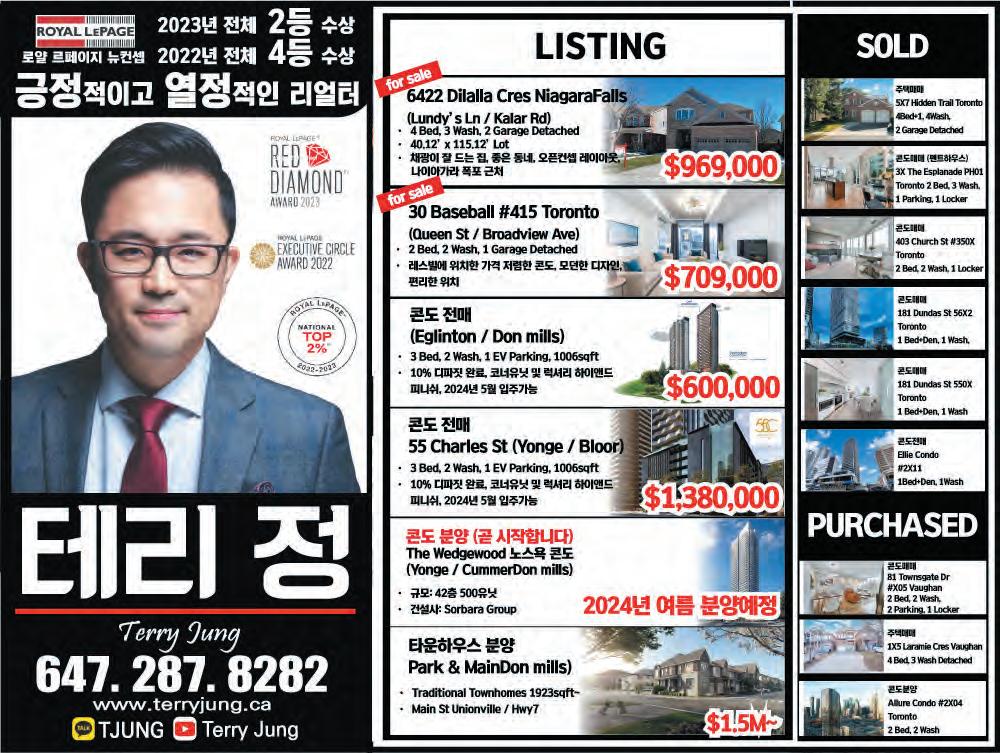 MLS #C6197024 번 3+1B 모던 타운홈Leased 노스욕 121cmahon 1+den SOLD Thornhill 디테치드 하우스 SOLD Festival 콘도 1+den분분양 양 Thornhill 월드온영 2B Leased콘도 뉴마켓 프리홀드 타운홈 SOLD OSHAWA 3B 세미디테치드 하우스 SOLD North York 28 Olive Ave.1BLeased Thornhill 2+1B 콘도 Leased 노스욕 킹스랜딩 콘도 2B 분 양 요밍 4베드 디테치드 분 양 오샤와 5베드룸 디테치드 SOLD 영&매이저맥 하이포인트분타운홈 양 리치몬드힐 4베드룸 디테치드SOLD 번 3베드 타운홈 SOLD 75 Canterbury 2베드 SOLD 38 Hollywood 2+1B SOLD 오샤와 3베드룸 세미디테치드 SOLD 번 4+1B 디테치드 하우스 SOLD 쏜힐 프로메네이드 콘도 1B 분 양 8188 Yonge 원플러스덴 분 양 173 Bog** 하우스Leased 반 패터슨 5베드룸 디테치드 SOLD 노스욕 10 Northway 2+1SOLD콘도 Joyce Won 647.987.7114 Sales Rep. tojoycewon@gmail.com 번 2+1B 타운홈SOLD Richmond Hill 3+1 타운홈 Leased 155 YorkvilleLeased 20 bloorviewLeased 38 Gran** 하우스Leased 옥빌 North Oak 1+den “ ” 10년 후 자산은 어떻게 달라질까요? 부동산과 경영이 만나면, 10년 후 달라질까요? MBA 리얼터 조이스와 함께 똑소리나는 부동산 투자를 설계해보세요! 고객의 자산은 규모와 관계 없이 모두가 소중합니다. 렌트도 매매도, 늘 한결같은 마음으로 최선을 다하겠습니다! 없이 한결같은 최선을 원미숙 하나금융그룹 본사 홍보실 근무(전) E.S. Brake 재무이사(전) 캐나다 한국일보 기자(전) 카이스트 경영학 석사(MBA) 이화여대 졸업 해외부동산투자전문지 Noble Asset 기자(전) Right at Home Realty 416-391-3232 416-739-7200 Sutton Group Admiral Realty 416-218-8800 Homelife Frontier Realty 캐나다 부동산 C. 416-566-8363 hwangs35@yahoo.com RIGHT AT HOME 황순일 Broker C. 416-891-3507 y_god@hotmail.com Sutton Group Admiral 이민정 Sales Rep. jcpark00@hotmail.com Right At Home 박정찬 Broker Sutton Group Admiral 김우철 Sales Rep. 박정훈 Sales Rep. C. 416-659-4380 realtorjhl@gmail.com Homelife Frontier Realty 이준호 Broker Liberty Village에 위치한 레스토랑 • 18년째 운영, 밝고 넓은 코너자리, • 짧은 운영시간 (월~금 7am~4pm) • 매상 증가 무한가능, 메뉴 추가 또는 변경 가능 • 토론토 다운타운 • Gerrard & Bay • 월 매상 $9,000 • 저렴한 렌트 • 트레이닝 세탁소 디포 • 도보거리에 병원, U of T 대학, China town • 식당, 커피, 소매 다수 업종 가능 • 1,196 sq ft Dundas/McCaul 다운타운 중심지 최고의 위치!! $6,900+T.M.I 2024년 GTA 주택 시장 동향 매물 74% 증가, 바이어 마켙 $65,000 * 4월에 주택과 콘도 7,114채가 매매, 2023년 4월 보다 5%가 줄었다고 토론토지역부동산위원회TRREB가 4일 발표했다. *평균매매가격은 $1,156,167로 작년 4월보다 0.3%가 올랐다. *매물은 18,088채로 작년 보다 74%가 늘었다. *새 매물은 작년보다 47%가 늘었다. $198,000 • Front / Spadina • 2 베드룸 • 2 화장실 • 5월 1일 입주 다운타운 콘도 렌트 $3,800 Rented