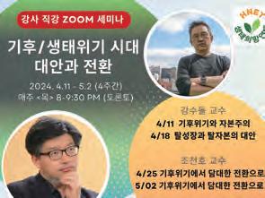 토론토 환경보호단체 생태희망연대 (대표 정필립)가 기후·생태위기 시대 대안과 전환에 대한 줌세미나를 다음 달 11일부터 4회에 걸쳐 마련한다.