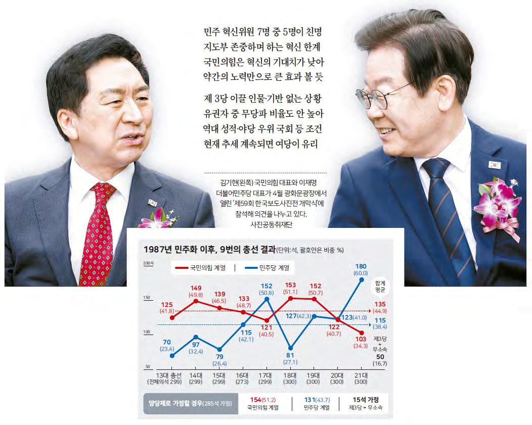 154석 대 131석. 강한 양당제일 경우, 한국 정치의 기본 구도이다. 과거에 비해 평평해졌지 만, 한국정치의 기본구도는 여전히 국민의힘이
