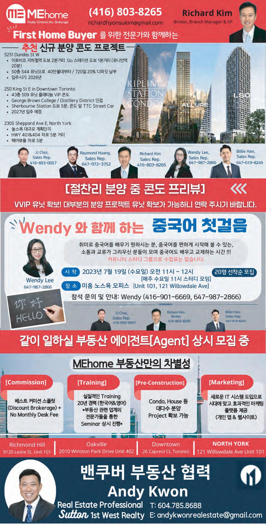 B16 Wednesday, August 2, 2023 2023년 8월 2일 (수) $937,000 Price 콘도 타운하우스 인기 있는 Willowdale East Sutton Group Security Real Estate Brokerage 2700 Dufferin St #47, Toronto ON M6B4J3 Direct: 416-400-5825 / Office: 416-654-1010 anabelserra75@gmail.com 세심하게 관리되고 업그레이드된 침실 2개 • 업그레이드된 개방형 개념의 거실, 식사 및 주방 공간 • 업그레이드된 세탁기/건조기, 새로 페인트 칠한 집 전체 및 주방 캐비닛, Fan 전자레인지, 침실 창문, 창문 셔터, 전등 설비, HWT(소유), 세탁 싱크대, 식기세척기와 청소된 덕트 실내 육상 트랙, 야외 수영장 및 실내 스케이트장이 있는 Mitchell Field 커뮤니티 센터 도보거리 상점, 레스토랑, 학교, 지하철 등까지 도보 거리! 매우 저렴한 유지비!! David Kee Sales Rep. 기원탁 647.501.9990 노스욕 M2M 콘도 전매
