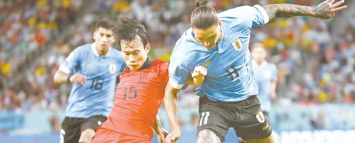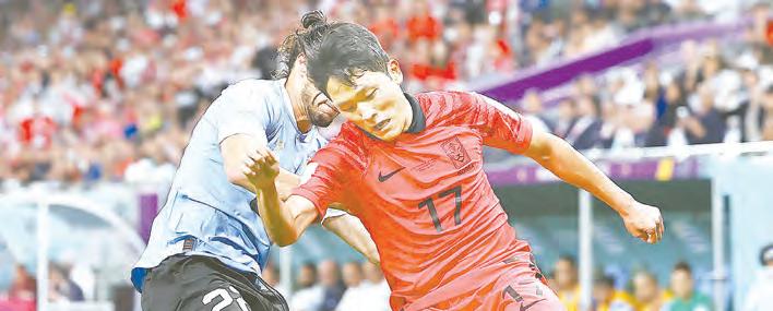 B2 Saturday, November 26, 2022 2022년 11월 26일 (토) 날은 이런 부분이 눈에 띄게 줄었다. 대신 골키퍼가 안 전하게 공을 멀리 보내놓고 필드선수들이 세컨드 볼을 쟁취하려는 모습이 상당히 보기 좋았다. 대표팀 공격에 필요한 전술이다. 다만 골을 넣기 위해서는 앞으로 공격 수들이 좀 더 과감해져야 한다. 특히 황의조가 마무리 를 잘 해 줘야 남은 월드컵 경기를 쉽게 풀어갈 수 있다. 월드컵이라는 큰 무대, 그중에서도 첫 경기는 누구에게나 부담스럽다. 그럼에도 24일 2022 카타르 월드컵에 첫 등장한 한 국 축구 국가대표팀 선수들은 강호 우루 과이를 상대로 주눅들지 않고 선전했다. 선수들의 간절함이 지구 반대편까지 느껴 진 경기였다. 이날 가장 빛났던 모습은 벤투호의 전 방압박과 협력수비였다. 전반적으로 대표 팀은 모든 선수들이 전방압박을 가했다가 물러나는 형식으로 경기를 풀어나갔다. 세 부적으로는 상대 선수가 공을 잡으면 앞 선에서부터 압박을 가했고, 이를 뚫어내면 두 명의 선수가 협력수비를 들어가며 상대 를 당황시켰다. 특히 대표팀은 기존에 많 이 선보였던 4-1-2-3 전술을 기본으로 하 면서도 수비 시에는 4-4-2로 대형을 바꿔 안정적으로 경기를 운영했는데 상당히 인 상적이었다. 선발로 나선 나상호와 김문환은 이날 본 인들의 역할을 완벽하게 해냈다. 나상호는 공격 시에는 저돌적인 돌파를 보여줬고, 공수 전환 상황에서는 앞 선에서부터 강하 게 상대를 압박했다. 김문환은 최근 많이 거론된 대표팀 오른쪽 풀백 포지션에 대한 불안함을 불식시킬 만큼
