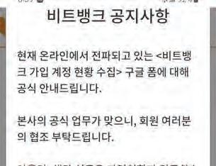 근거 없는 이야기"라며 "올해 비트코인을 포함한 전 세계 가상 화폐들이 폭락하고 9월 중순에는 다른 가상화폐에 중복 투자했던 회원들이 대거 해지하면서 어려움 이 발생한 것"이라고 해명했다. 김 씨는 비트뱅크 한국 본사의 공지 로 10월20일부터는 회원 가입도 중지한 상태라고 말했다. 다만 그는 "한국 6개 도시에 분산돼 있는 채굴 장비와 채굴 된 가상화폐에 대한 담보금 등 이 있기 때문에 원금 반환은 가 능할 것"이라며 "한국