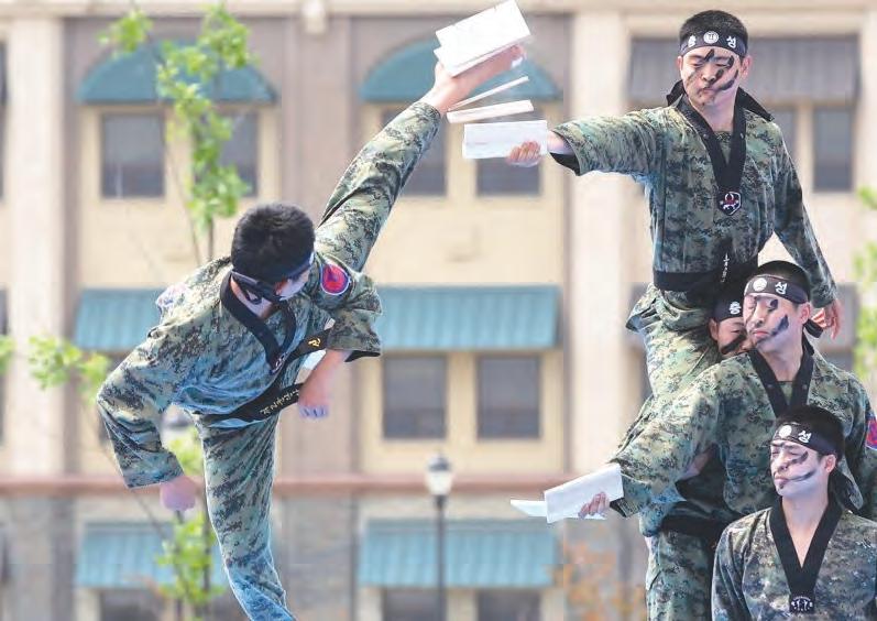 지난달 30일 경기도 평택시 캠프 험프리스에서 열린 '카투사-주한미군 친선 주간' 행사 개막식에서 육군 제2군단 태권도 시범단이 송판을 격파하고 있다.