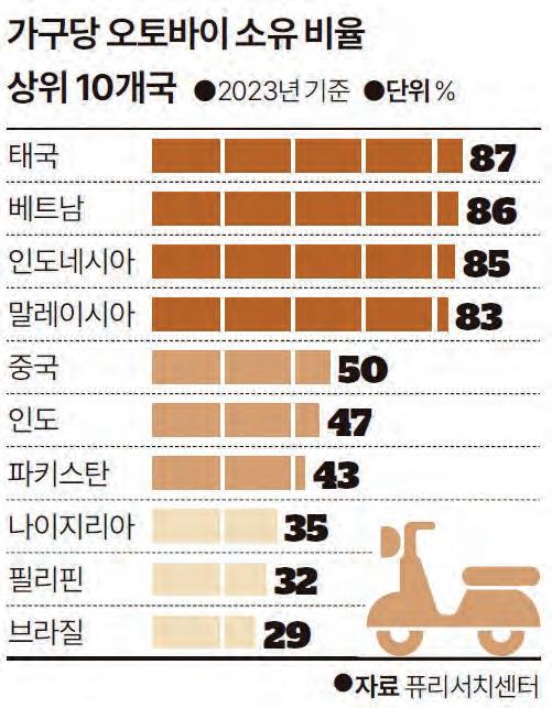 오토바이 소유 비율’상위 10개국 가운데 5 곳이 동남아 국가였다. 태국 가구 87%가 최