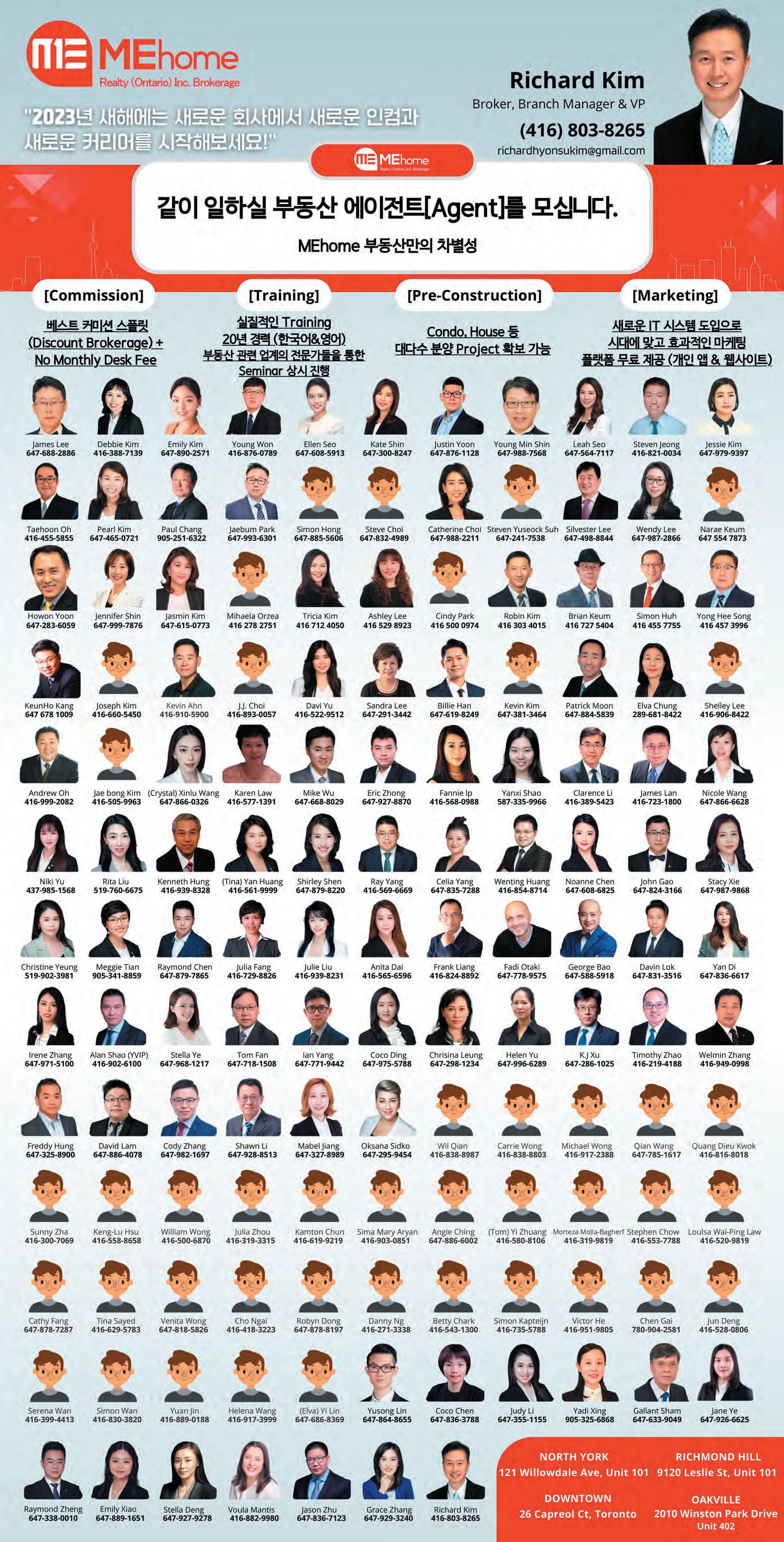 B7 Friday, December 9, 2022 2022년 12월 9일 (금) 부동산 John Cho President Richard Cho Broker of Record 본사 : Tel (416) 223-3535 (24Hours) 6321 Yonge St. North York, ON M2M 3X7 레슬리 지점 : Tel (416) 449-7600 (24Hours) Toll Free : 1-877-449-7600 Fax (416) 391-5243 1993 Leslie St., Toronto 미시사가 지점 : Tel (905) 624-2001 (24Hours) Fax (905) 624-4923 257 Dundas St. E. Unit #2, Mississauga, ON, L5A 1W8 한인이 직접 경영하는 최대의 부동산 그리고, 혜택까지 당신과 함께 합니다. 분양 전매 관리 매매 Condo 특별 임성주, 강병욱 배상 - Sheppard and Leslie - 전철역, GO Station 바로 앞 - 각종 상업시설 주위에 있는 노스욕 요지 - Green Space 안에 위치한 뛰어난 주거환경 - 5개동 1793 유닛의 대규모 단지 - 영/쉐퍼드 노스욕 코어 위치 - 16층 350유닛/ 2026년 입주 - Fieldgate & Westdale 건설 - 교통,상권,교육등 주거시설 완벽 - 다양한 부대시설 갖춤 North Core (노스욕) - 라이어슨 대학 바로 건너편 - 교통,상권,교육,건강등 모든 조건 완비 - 경쟁력있는 가격,디포짓구조 - 69층 819 유닛/ 2027년 완공 - 2022년 추천 프로젝트 8 ELM (다운타운) Central Park (노스욕) - 반( Hwy7 and Jane) - 3 베드, 2Bath - 1 파킹,1라커 - 950 Sqft+ 170 Sqft 발코니 Transitcity 3베드 $898,000 $649,000 미드타운 콘도세일 - 68 Merton 8층 - 조용한 남동향 1베드 - 463 SF 밝은 유닛 - 교통이 편리한 투자유닛 $799,000 미드타운 Whitehaus 콘도세일 - 2베드+2 Bath +1파킹+1라커 - 730 Sqft 유닛+ Full 발코니 - 막힘없는 북쪽 뷰 - 33 Helendale Ave. $899,000 -E2 콘도 (2 베드+2 화장실) -1 파킹 -남/동쪽 코너 유닛 -750 sq.ft + 105 (발코니) -높은층 -E2 콘도 (2 베드+2 화장실) -동쪽 유닛 -750 sq.ft + 105 (발코니) -높은층 -Pinnacle 콘도 -호수가 보이는 2베드 -1 파킹 포함 -높은층 -북동쪽 탁터인 전망 콘도 렌트 미드타운 새콘도 렌트 미드타운 콘도 렌트 다운타운 새콘도 렌트 $649,000 $3200 $649,000 $3700 $649,000 $3500 토론토 전 지역 신규콘도 분양 전매 주택 매매 Salesperson 박영숙 Young sook Park youngsook73@hotmail.com 416.220.8989 팔구팔구 신규콘도 분양/매매/전매/주택 전문 C:416-473-7142 O:416-449-7600 Ashley Lee realtorashleylee@gmail.com ELEKTRA 콘도 분양 오픈하우스 로케이션:218 Dundas St. East, 토론토 다운타운 중심부 위치 빌더:MENKES 규모: 48층 /약 500 유닛 가격: 60만불 후반부터 입주예정: 2027년 **스시 점심식사 와 음료수 제공** ▶ 일시: 6월 25일 (토) 12:00 (정오) – 오후 4시 ▶ 장소: 4954 YONGE ST, MENKES SALES OFFICE 접수 : ASHLEY LEE(이현주) 416-473-7142 명성있는 빌더 MENKES 사의 ELEKTRA 콘도 VVIP 최초 분양가격으로 여러분을 모십니다. 416.449.7600 1993 Leslie St. Toronto ON M3B 2M3 416-223-3535 6321 Yonge St. North York, ON M2M 3X7 905.624.2001 257 Dundas St. E. Unit #2 Mississauga, ON L5A 1W8 40년 경력의 기록적인 실적을 세운 부동산회사 조준상대표 John Cho Broker of Record 캐나다 전역에 잘 알려진 ‘Royal Lepage’ 브랜드 소송과 부동산 전문 변호사가 현 매니저임 분양 건축회사들과의 강한 유대관계 TD은행을 포함한 모기지 전문가들 상주 계열사 로펌이 상주하여 법률과 관련된 지원 제공 – Realty Care Law LLP 모든 행정 서비스 및 비서업무 지원 변호사가 제공하는 교육 및 훈련 프로그램 Since 1989 우리의 임무는 단순 명확합니다 여러분의 성공을 위하여 최선을 다하는 것입니다 Our mission is simple: thing possible to make you ful in this career Richard Cho, Royal LePage New Concept General Manager We are now recruiting new Sales Representatives to join our Brokerage. 로열르페이지 뉴컨셉 한인부동산이 새 중개인을 모십니다. NOW Recruiting Royal LePage New Concept, Brokerage “한인이 직접 경영하는 최대의 부동산” 본사 : Tel (416) 223-3535 (24Hours) 6321 Yonge St. North York, ON M2M 3X7 레슬리 지점 : Tel (416) 449-7600 (24Hours) Toll Free : 1-877-449-7600 Fax (416) 391-5243 1993 Leslie St., Toronto 미시사가 지점 : Tel (905) 624-2001 (24Hours) Fax (905) 624-4923 257 Dundas St. E. Unit #2, Mississauga, ON, L5A 1W8 이금명 M.Ed., Broker Ellena Cho realtor.ellenacho@gmail.com 신규콘도 분양/매매/전매/주택 전문 ·주소 : 5840-5870 Yonge St ·빌더 : Plaza Corp ·규모 : 32층 374유닛 ·가격 : 50만불대부터 ·입주 : 2026년 예정� ·위치 : Liverpool Road 서쪽 & 401 북쪽 ·빌더 : Tribute ·규모 : 3개의 타워, 1300유닛 ·가격 : 40만불대 부터 ·피커링 go 스테이션 도보 8분� 토론토다운타운까지 go train 으로 25분 Plaza On Yonge (5858 Yonge st. 노스욕) VuPoint 콘도 (피커링) O:416-449-7600 C:416-722-0797