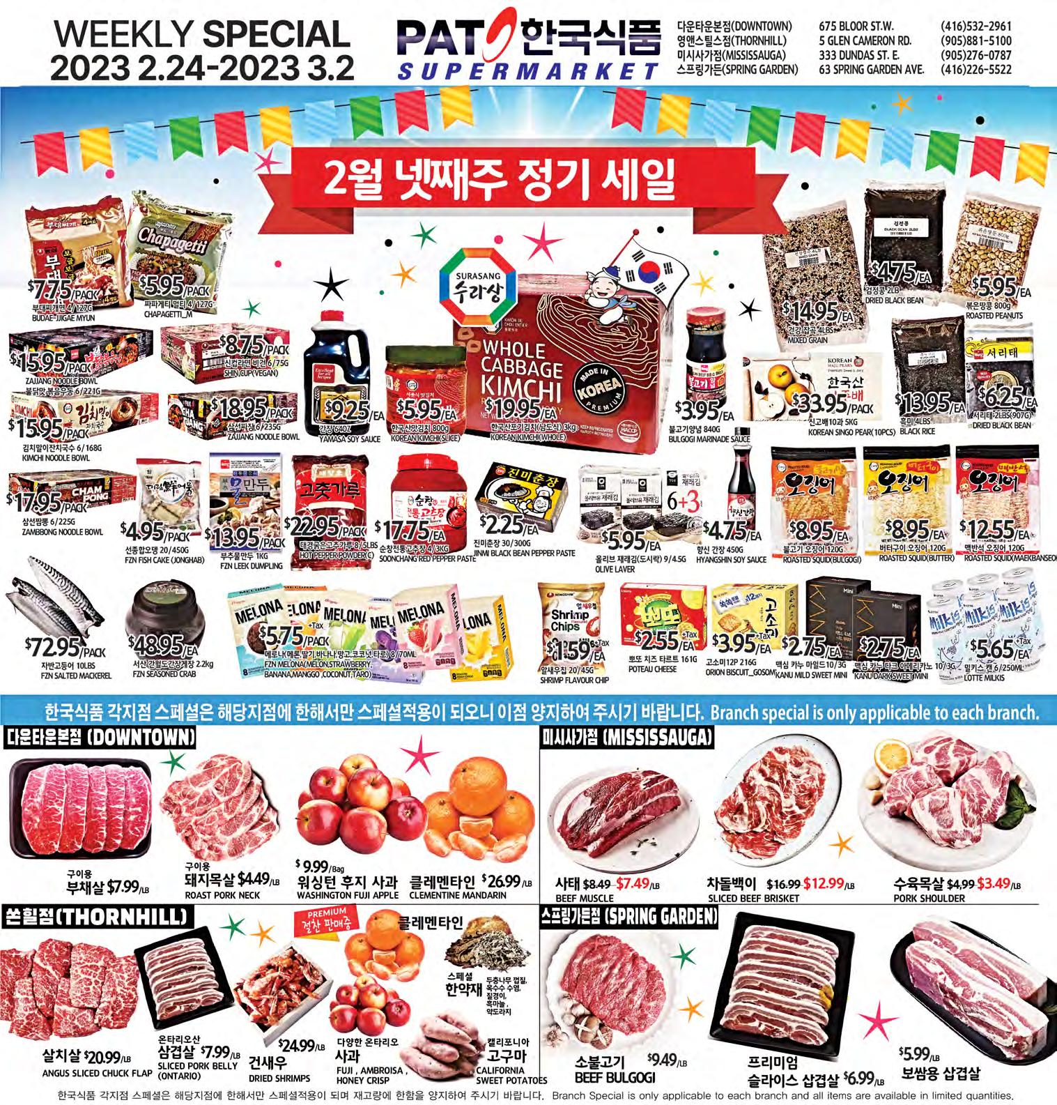 2023년 2월 24일 금요일 조기, 갈치, 통고등어, 오징어등 다양한 수산물 가득 준비하였습니다. 달콤한 과일과 신선한 채소를 좋은 가격으로 판매중입니다. 647-869-7370 Etobicoke Business Hour 175 the west mall Etobicoke 배추 BBQ Restaurant 1. 갈비찜 2. 양념코다리 3. 해파리냉채 4. 보쌈 5. 잡채 6. 모듬 새우튀김 7. 탕수육 8. 홍어회 9. 겉저리 10. 나물 11. 오이무침 12. 우거지국 캐터링 오더는 10인 이상 해와달에서 파티 예약 받습니다 "첫돌 한복, 돌잡이, 배경 사진 준비 되어있습니다" $40 12시부터~3시까지 해와달 코리안 B.B.Q 착한 가격으로 정성스럽게 모시고자 합니다. ** 런치스페셜은 주중에만 햇고구마 1. 고등어 정식 2. 김치찌개 3. 우거지해장국 4.된장찌개 Special $12.95 무 햇밤 Special