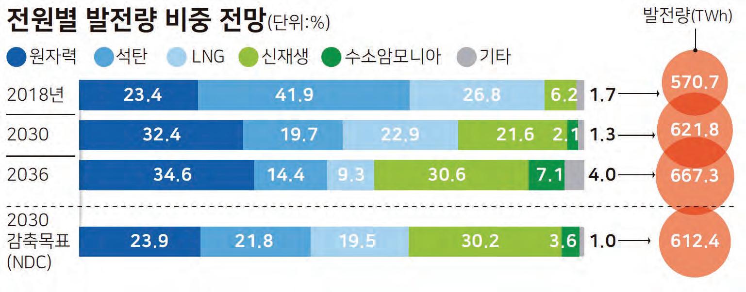 B2 Friday, January 13, 2023 2023년 1월 13일 (금) 전력수급기본계획 확정 38.1GW에서 27.1GW로 11GW 줄어든다. 정부는 원전과 신재생에너지 발전 비중을 단계적으로 높여 2036년 원전은 34.6%, 신재생에너지는 30.6%까지 확대한다는 방침이다. 이 장관은“신재생에너지 비중은 각 국가 환경마다 다르다”며“우리나라 현실에 맞게 지속적 으로 늘리겠다”고 밝혔다. 이윤주 기자 윤석열 정부의 전력정책 방향을 담은 제 10차 전력수급기본계획(2022~2036년)이 12일 확정됐다. 2030년 전체 발전량에서 원전과 신재생에너지 비중을 각각 32.4%, 21.6%로 높이고, 석탄은 19.7%로 낮춘다. 문재인 정부가 제시한 2030년 국가 온실 가스 감축목표(NDC) 안에서 원자력 비 중은 크게 높아지고, 신재생에너지와 석탄 비율은 낮아졌다. 산업통상자원부는 이날 전력정책심의 회를 열고 2036년까지 발전원별 발전량 비중과 설비 확충 목표 등을 담은‘제10차 전력수급기본계획(2022~2036년)’을 확정 했다고 밝혔다. 이번 정부 들어 처음 수립 된 전기본이다. 전기본은 앞으로 15년 단 위의 중장기 계획으로 전력 공급·수요 전 망과 관리, 발전 설비 확충 방안을 담아 2 년에 한 번씩 만든다. 이에 따르면, 2021년 기준 27.4%였던 원전 비중은 계속 운전과 신한울 3·4호 기 준공 등을 반영해 2030년 32.4%까지 늘린다. 지난 정부의 NDC 상향안(원전 23.9%, 신재생 30.2%, 석탄 21.8%)에 비 해 원전 비중은 8.5%포인트 가량 높이고 신재생 비중은 8.6%포인트, 석탄은 2.1% 포인트 줄였다. 산업부는 10차 전기본이“특정 분야를 지원하고자 하는 의도가 아니며 에너지 안 보 관점이 반영된 것”이라고 강조했다. 산 이 많은 우리나라 환경에서 태양광이나 풍 력 등 재생에너지 발전 비중을 빠르게 늘 리는 데 한계가 많은 만큼 원전 확대는“실 현가능성”을 감안한 선택이란 얘기다. 이창양 장관은 전날 국회 산업통상자원 중소벤처기업위원회에 10차 전기본을 보 고하며“2021년 10월에 만든 NDC가 현 실성 있다고 생각하지 않는다”면서“지나 치게 높아서 달성이 어렵다”고 말했다. 이 어 그는“(목표안을) 유지하기보다는 현실 적 숫자를 제시하는 게 맞다”고도 했다. 이 장관은“세계적 추세는 신재생 부각 과 원전 부활”이라며 장기적으로는 두 분 야가 전력 공급의 투 트랙을 맡을 것이라 고 덧붙였다. 이전 정부 목표치보다 신재 생에너지 비중이 줄었지만 전체 전력 수 요가 늘기 때문에 신재생에너지 설비도 늘린다는 얘기다. 2022년부터 해마다 전력 수요가 1.5%씩