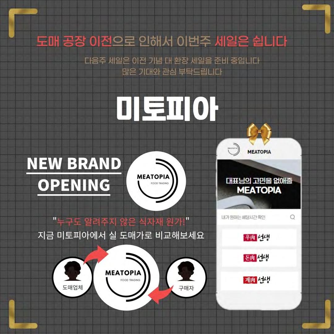 2022년 11월 11일 금요일 도매업체 구매자 “누구도 알려주지 않은 식자재 원가!” 지금 미토피아에서 실 도매가로 비교해보세요 미토피아 NEW BRAND OPENING meatopiafoodtrading.com 2655 Lawrence east #1a 416-755-5245(고기사요)