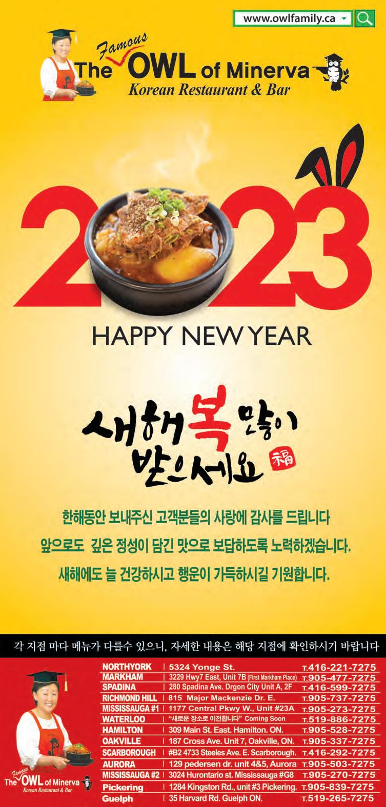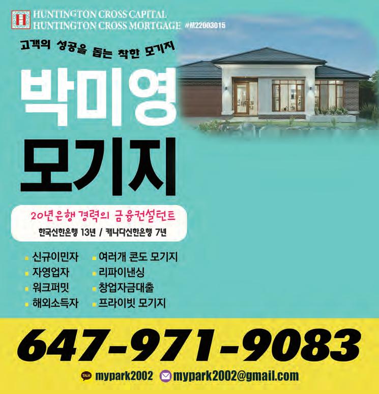 6 JAN. 2023 조승우조승우 배우 P24 The PHANTOM of the OPERA P43-61 Kocom Security 알람, CCTV, 방범 게이트 416.769.3532 1.800.686.0064 Christophe Preobrazenski 형법변호사 100 Richmond St.W., Suite 414 (Sheraton Richmond Tower내) 416-964-1717(O) 416-580-1408(C) 한인상담 Esther Park 647-271-6782 30년 이상의 풍부한 경험 39년 이상의 풍부한 사업체•부동산•임대계약 회사설립•위임장•공증•유언장 캐나다 최초의 한인 변호사 강찬영변호사 Tel 416-221-1417 7368 Yonge Street, #PH-K, Thornhill 4 Church Street South Richmond Hill, ON, L4C 1W2 647-961-0453 보톡스 & 필러 전문 탄력 리프팅 주름개선/ 염승한 모기지 416-732-3104 염려없는 모기지 143694_L FSRA #12360 CONCE T 143694_L FSRA #12360 416-419-3215 노스욕(월·화·목·금) 미시사가(수·토) Sheppard Ave. W. 647-797-2445 달력 제작 전문업체 / 각종인쇄 / 티셔츠 / 트로피 교회 컬러주보 / 세례증서 비둘기인쇄 라벤더 416-892-3110 (타월) Dr.JUNG BAEK Dr. PAULA OH 화/수/금/토/일 Lenz Avenue Tel. 905 257 0770 2525 Prince Michael Dr. 옥빌 안경점 강운기 Jacob Kang Mortgage Specialist jacob.kang@rbc.com 647-831-6199 쿨링 라이언 최 Ryan Choi 647-614-2499 info@air24.ca •가정 냉난방벽걸이 에어컨 (정부 지원금 60% 까지) 무료 견적 •TSSA 인증업체 Lennox / Carrier / Goodman 퍼니스 에어컨 보일러 구글인증업체 에어24 646 Bloor St. w, Toronto (매직건강내) 647.280.2152 www.magichealthfood.com 돈, 사랑, 사주, 사업, 진학, 취업, 자녀, 결혼, 건강, 성공, 정신, 고민 상담환영 동방박사 운명상담