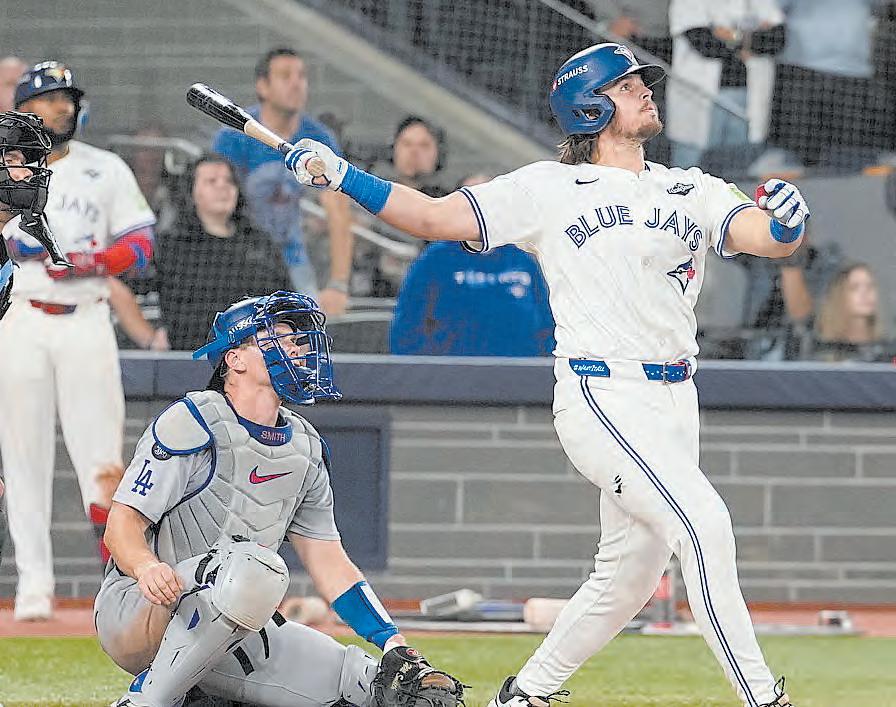 토론토 로저스센터에서 열린 월드시리즈 1차전 6 회말 블루제이스 타자 애디슨 바저가 만루 홈런을 날리 고 있다. 이날 LA다저스를 11-4로 누른 블루제이스는 25일 2차전에선 1-5로 패