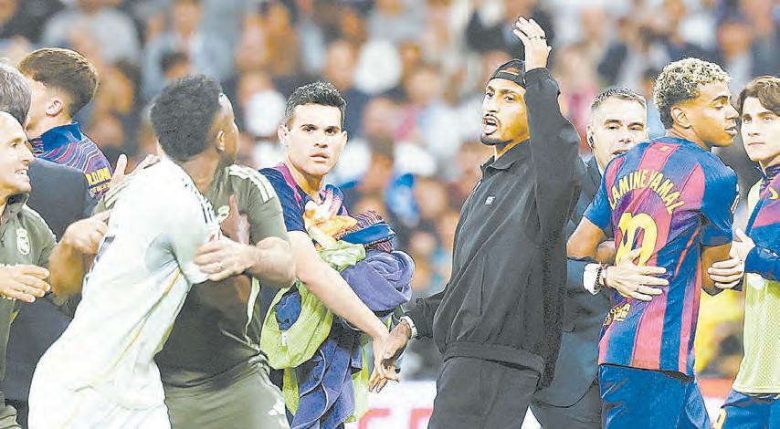 ▲ 레알 마드리드의 비니시우스 주니오르(왼쪽 두 번째)가 27일(한국시간) 스페인 마드리드의 산티아고베 르나베우에서 열린 FC바르셀로나와의 2025~26시즌 라리가 10라운드가 끝난 뒤 라민 야말(오른쪽 두 번째)에게 말싸움을 걸고 있다.
