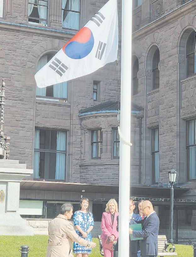 인정하고 이를 널리 알리기 위해서였 다. 이를 계기로 매년 10월 초 한인사 회는 온주정부 관계자들과 함께 퀸스 파크에서 태극기