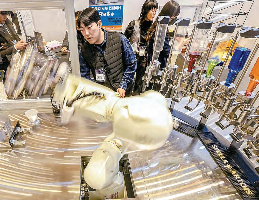 서울 강남구 코엑스에서 개막한 ‘2026 호텔페어’를 찾은 관람객들이 칵 테일 제작 로봇을 살펴보고 있다. 3일간 열리는