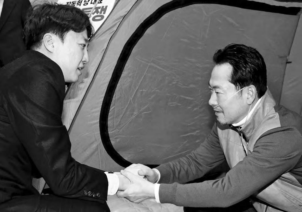 국민의힘 대표가 21일 국회 로텐더홀 단 식 농성장을 찾은 이준석 개혁신당 대 표와 인사하고 있다. 최주연 기자