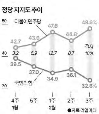다 의총 상황을 언론에 전해야 할 원내 수석대변인 3명도 먼저 자리를 떴다. 정당 지지율은 더 떨어졌다. 이날 공개 된 리얼미터 여론조사 결과, 정당 지지 도에서 더불어민주당 48.6%, 국민의힘 32.6%를 기록했다. 리얼미터 조사 기준