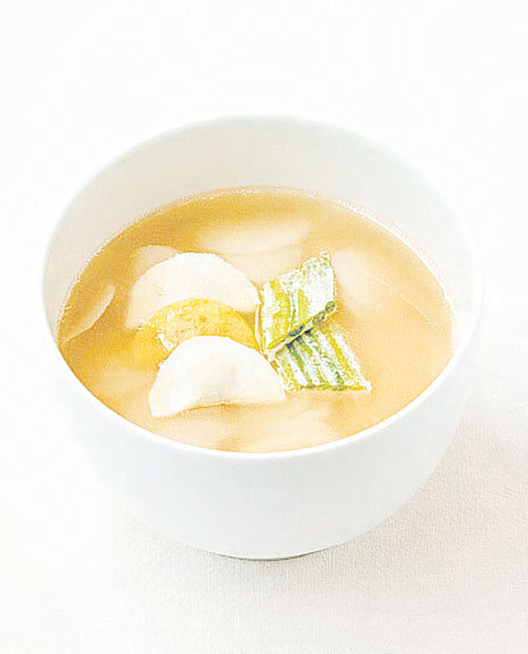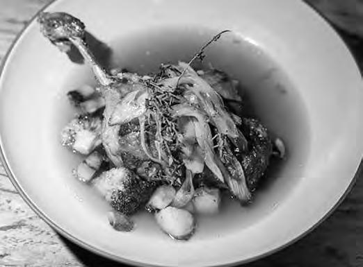 ◀ 오리 콩피와 버섯 콩 소메(Duck Confit with Mushroom Consommé). 콩피(Confit)는 오리 나 거위 고기를 자체 지 방에 절여 저온에서 서서 히 익히는 프랑스 보존 조 리법이다. 바삭한 껍질과 결대로 찢어지는 부드러 운 속살이 특징이며 맑은 버섯 육수와 곁들인다.
