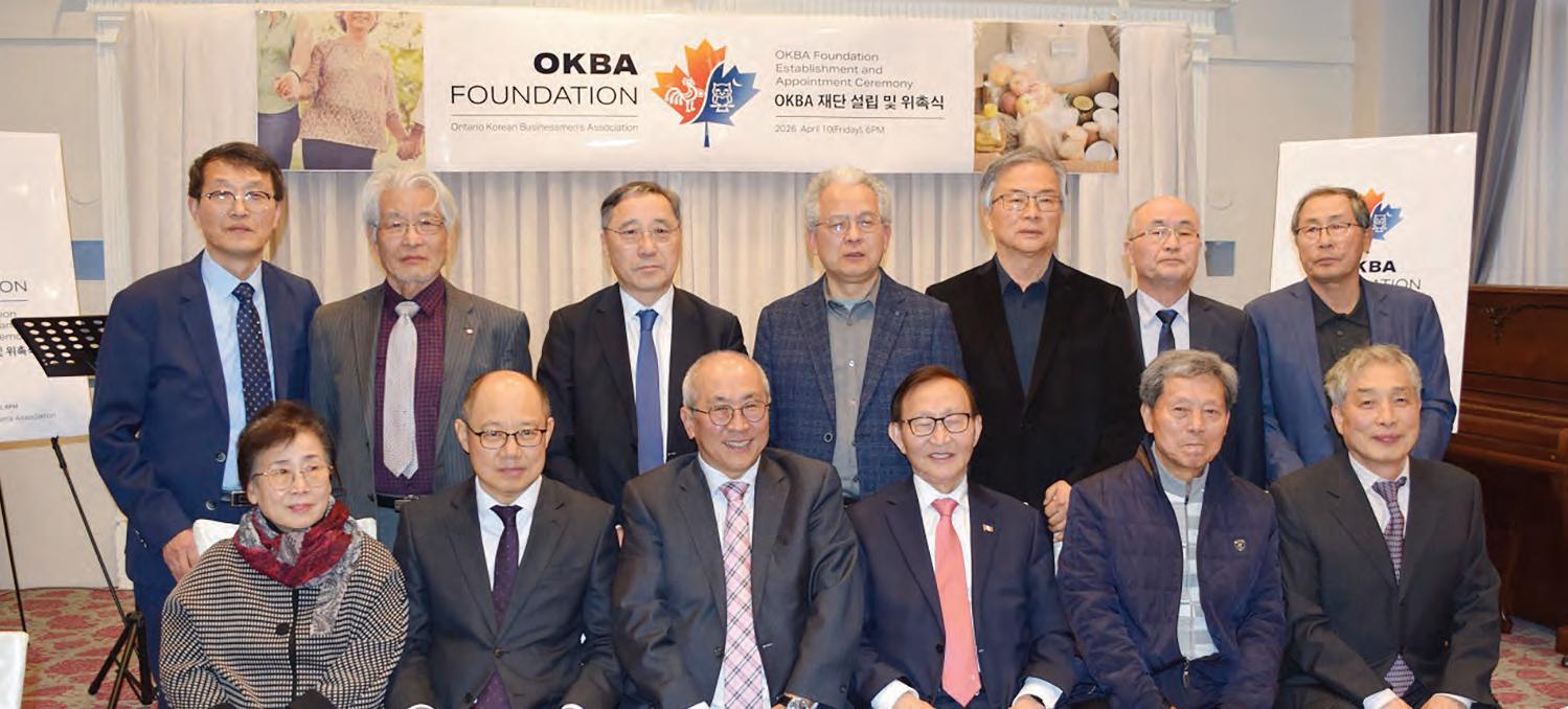 ▲ 실협재단 출범식 참석자들. 뒷줄 왼쪽부터 신재균 실협 부회장(실협재단 이사), 김명규 한국일보 발행인, 한석현 목사(재단 이사), 류무열 실협 이사장(재단 이사), 윤종실 전 실협회장(재단 이사), 오승진 전 실협회장(재단 이사), 조영권 토론토코리안 저널 발행인(재단 이사). 앞줄 왼쪽부터 김정희 토론토한인회장, 김영재 토론토총영사, 심기호 실협회장(재단 이사), 조성준 온주 노인복지장관, 이민복 PAT한국식품 블루어점 대표(재단 이사), 이화영 농산물나라 대표(재단 이사). 사진 한국일보