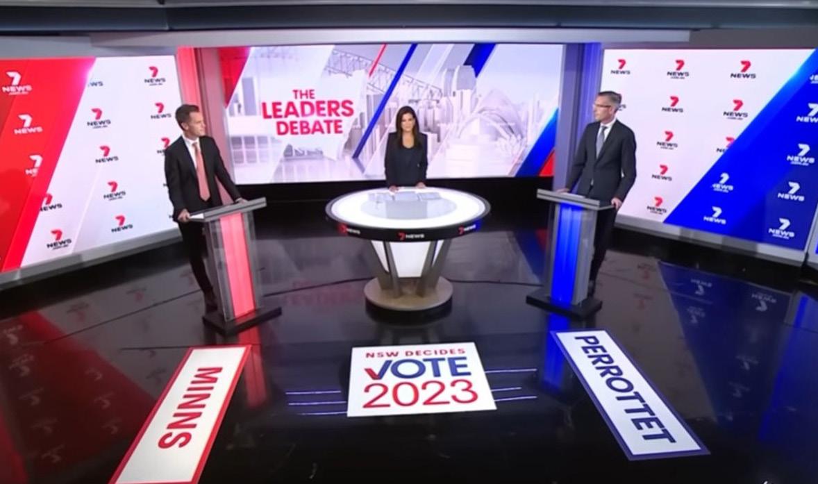 올해 NSW 주 선거가 한 주 앞으로 다가왔다. 올해 선거에서는 일부 선거구에서의 무소속 후보들 의 약진, 노동당의 강세로 인해 다수 의원들이 은퇴를 선언한 자유당의 상당수 의석을 빼앗아 갈 것으로 예상된다. 사진은 7 News 방송의 양당 대표 정책 토론회. 사진 : 7 News 방송 화면 캡쳐