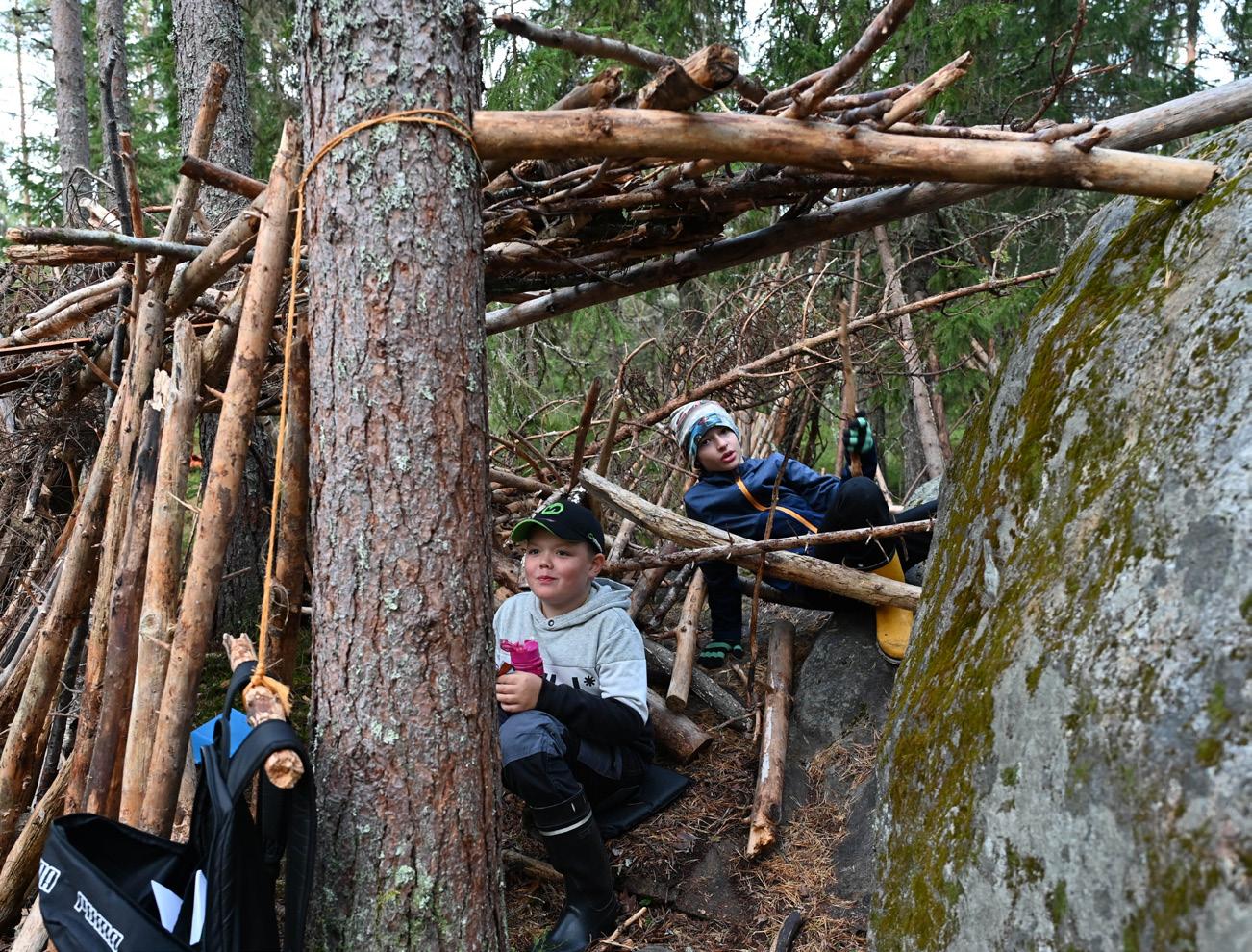 – Det är jättebra i Skolskogen. Det roligaste är att bygga kojor, säger de och förklarar att i dagis heter det Mulleskogen men när man börjar ettan blir det Skolskogen.