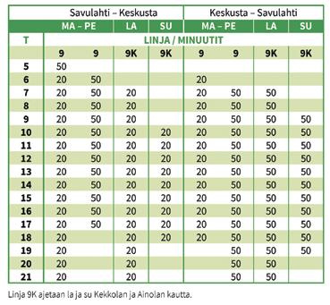 Viikonloppuisin linja ajetaan tunnuksella 9K ja kesäaikataulussa sen vuoroväli on yksi tunti. 9K tekee ylimääräisen lenkin Kekkolassa, mutta Novan ympäristössä ja Kortepohjassa reitti on sama kuin arkisin.