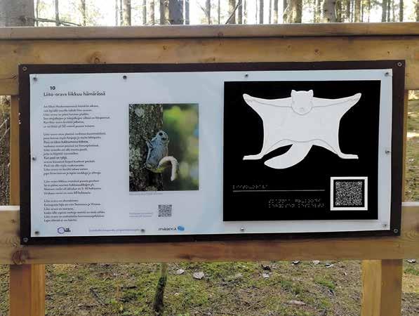 Infotauluissa kerrotaan mielenkiintoista tietoa alueen eläimistä ja kasveista. Hämärällä liikkuessa saattaa nähdä liito-oravan.