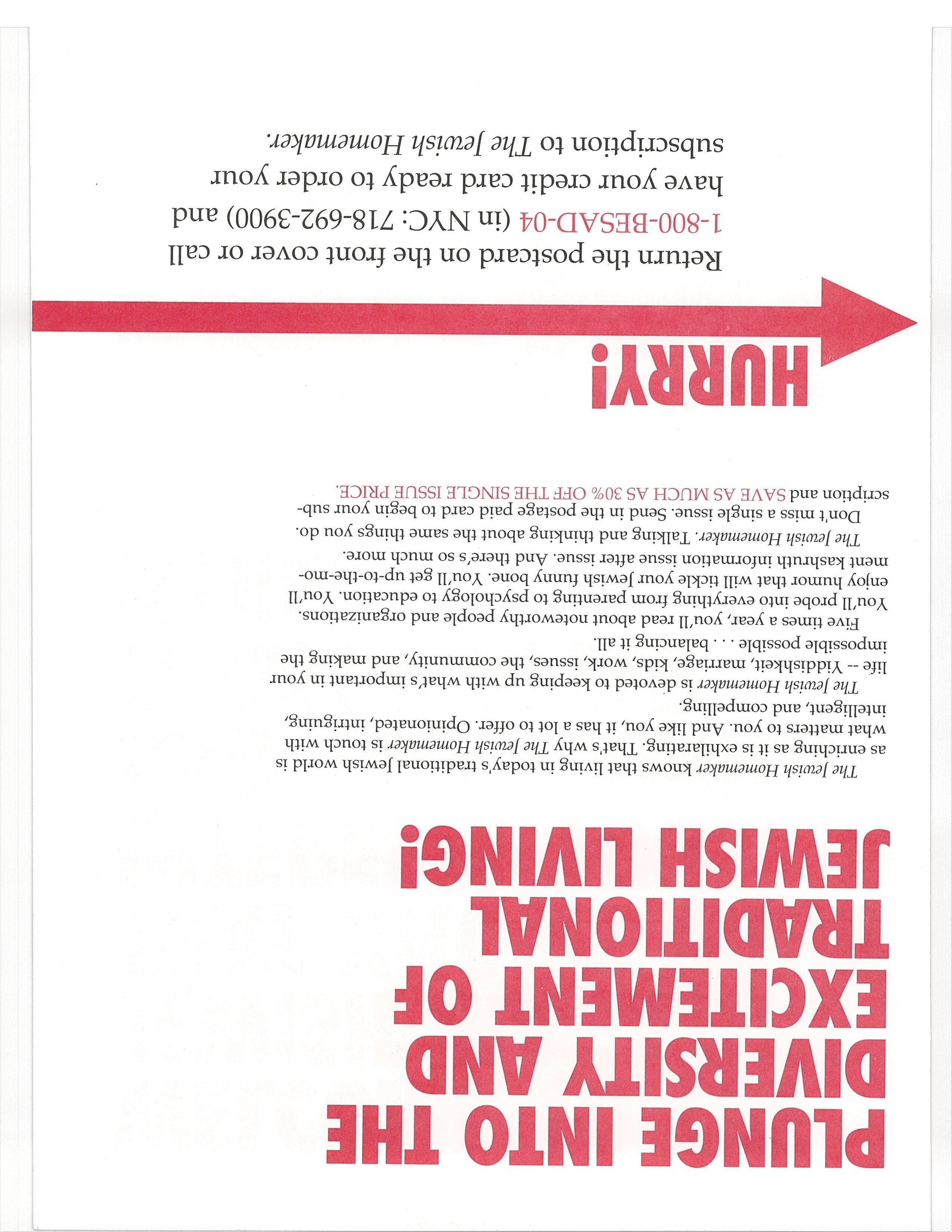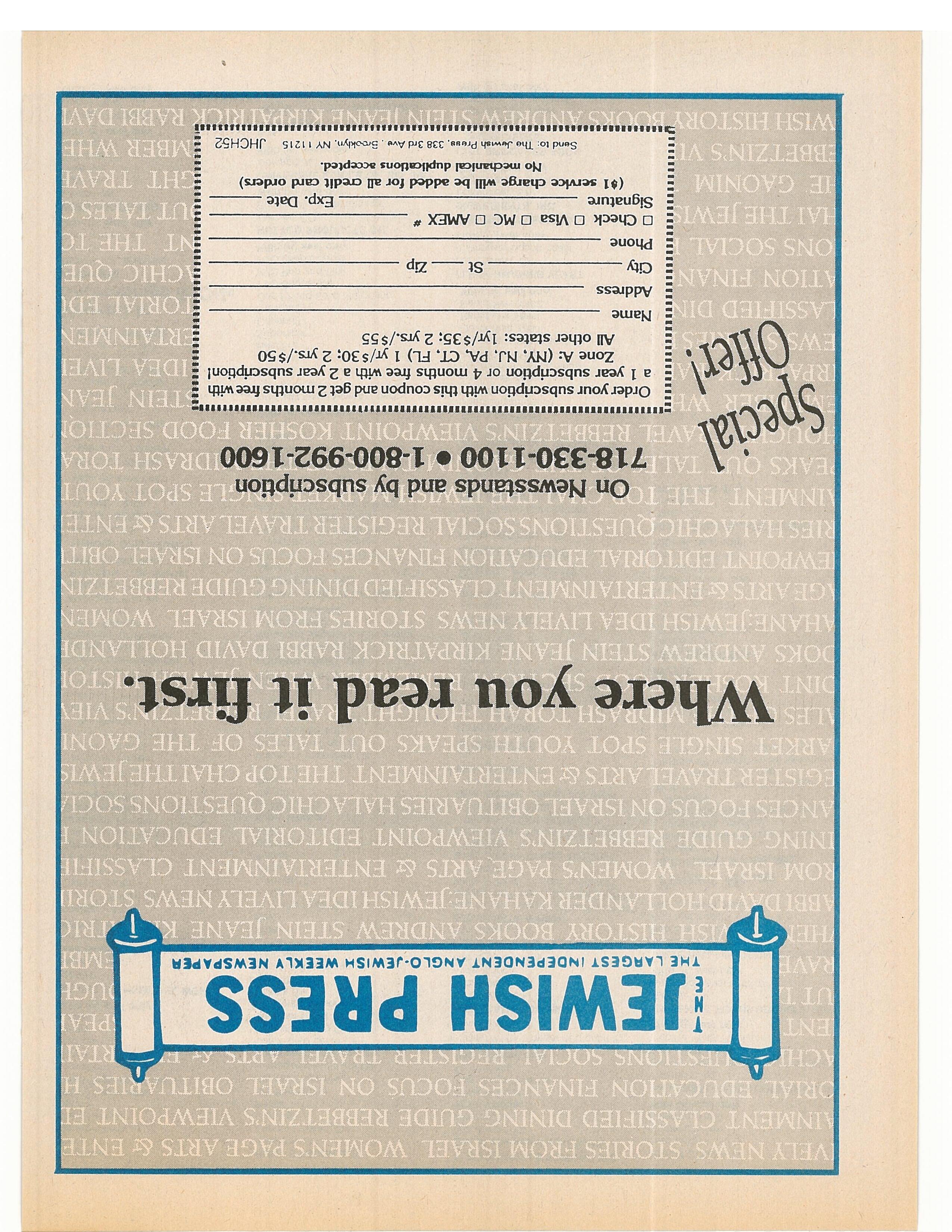 JEWISH PRESS T~IE ARGEST NOEPENOENT ANGLO.JEWIS~4 WEE~CLV NEWSPAPER n ewss dsandb~t 718-30- 100•1- 0~111~~111111.111t1s111nI1tI1IJI11IwIIuhs.u,.nr,,urii tiiiissiia Iftilul. ~ Orderyour subscription with thiscoupon and get 2 monthsfreewith ~ E a 1 year subscription or 4 months free with a 2 year subscription! ~ = Zone A: (NY. NJ, PA, CT, FL) I yr/S30; 2 yrs./$50 All other states: lyr/$35: 2 yrs./$55 ~Name ~ Mdress City St_Zip :Ptione ~ DCheck[~)VlsaDMCDAMEX’~ ~ Signature Exp. Date (~I service charge will be added for all credit card orders) No mechanical duplications accepted. Send to Thu Jew,eh Pre,ie. 338 3rd Ave B~ts~dyn. NY 1121 S JHCH&2 ~I liii •aai ii nis .ii~ms • iiaiauiuijiaiipa~i 111111 II Ilift I III III