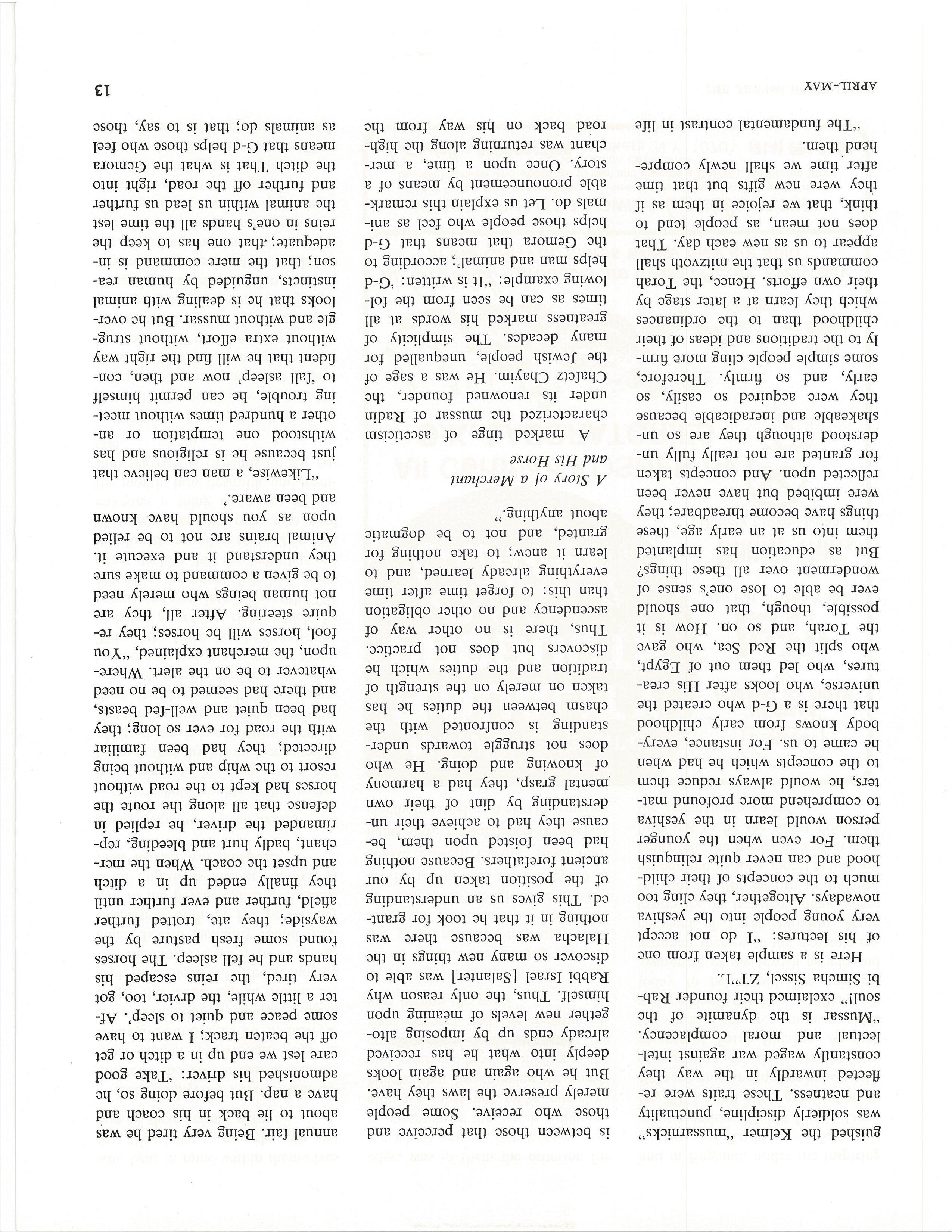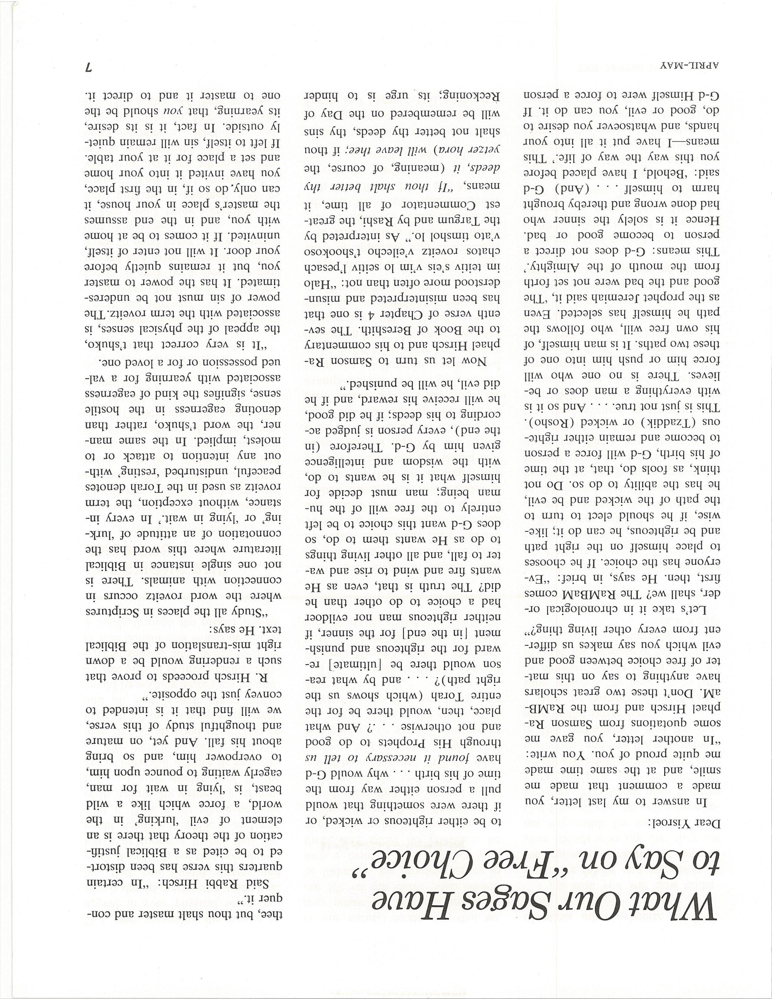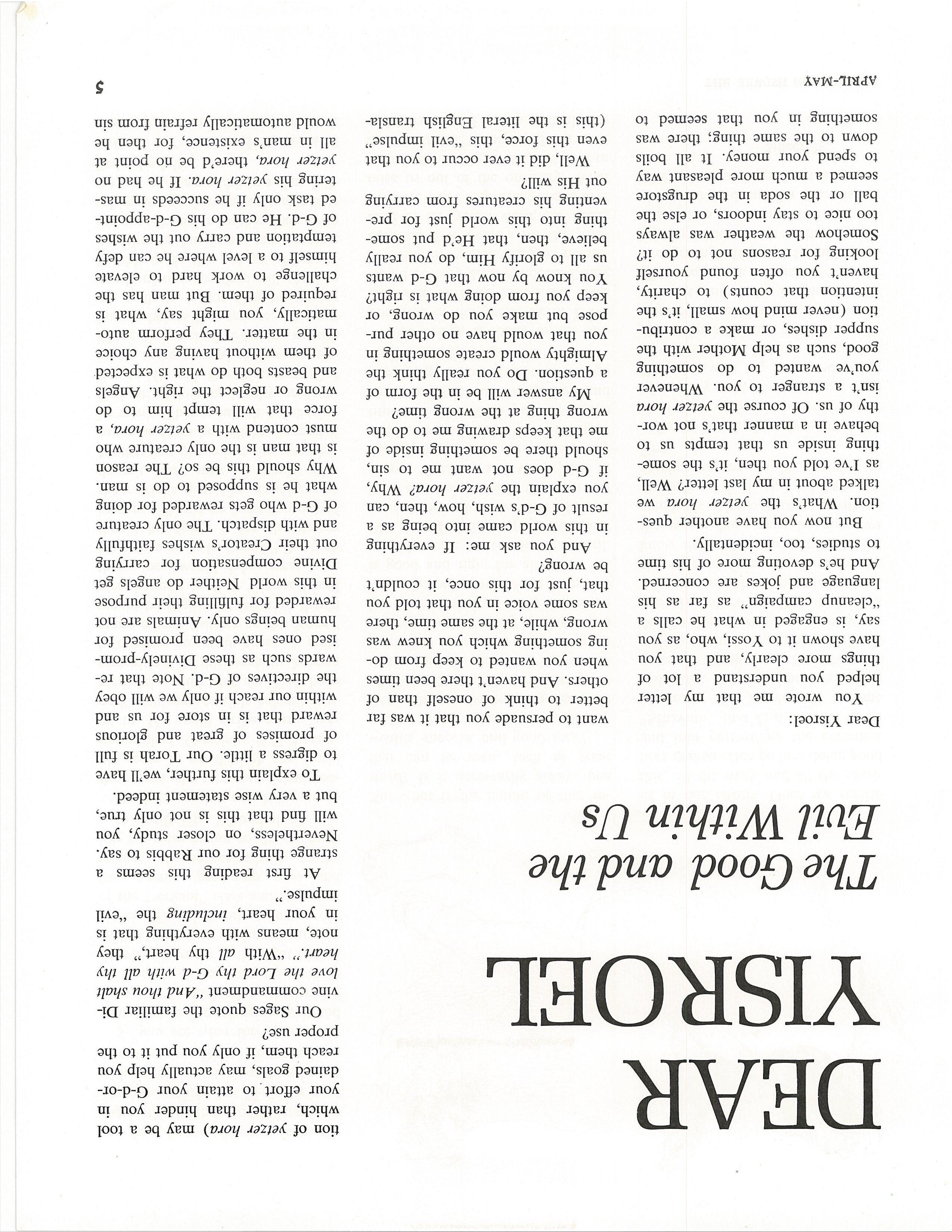 The Good and the Evil Within Us and What Our Sages Have to Say on “Free Choice.” Two letters from a Rebbi to his Talmid. Utilizing the Yetzer Hora as another means to prove our love for G-d and dedication to our purpose. A continuation of the corres pondence published in previous issues.
