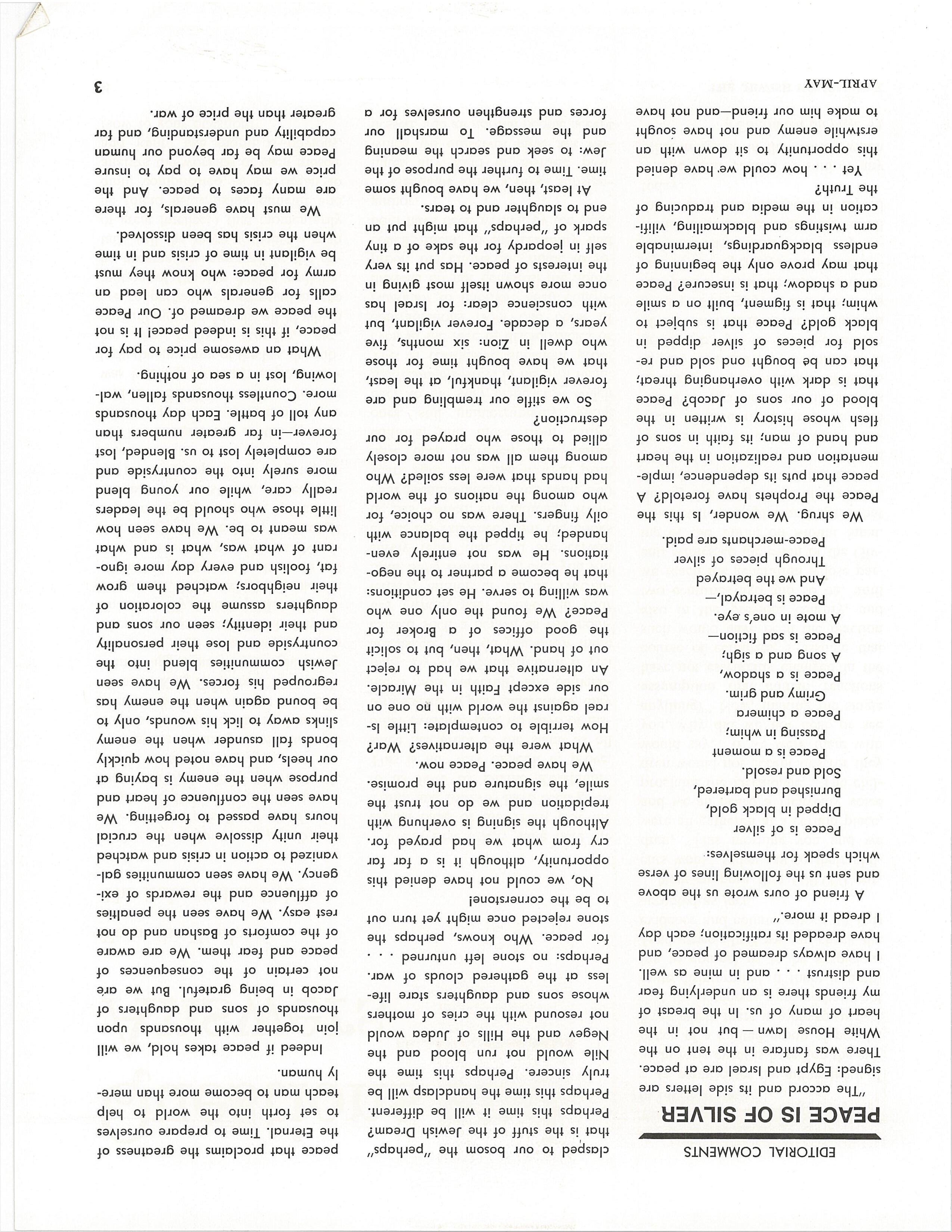 Peace-merchants are paid. We shrug. We wonder, Is this the Peace the Prophets have foretold? A peace that puts its dependence, imple mentation and realization in the heart and hand of man; its faith in sons of flesh whose history is written in the blood of our sons of Jacob? Peace that is dark with overhanging threat; that can be bought ond sold and re sold for pieces of silver dipped in black gold? Peace that is subject to whim; that is figment, built on a smile and a shadow; that is insecure? Peace that may prove only the beginning of endless blackguardings, interminable arm twistings and blackmailing, vilifi cation in the media and traducing of the Truth?