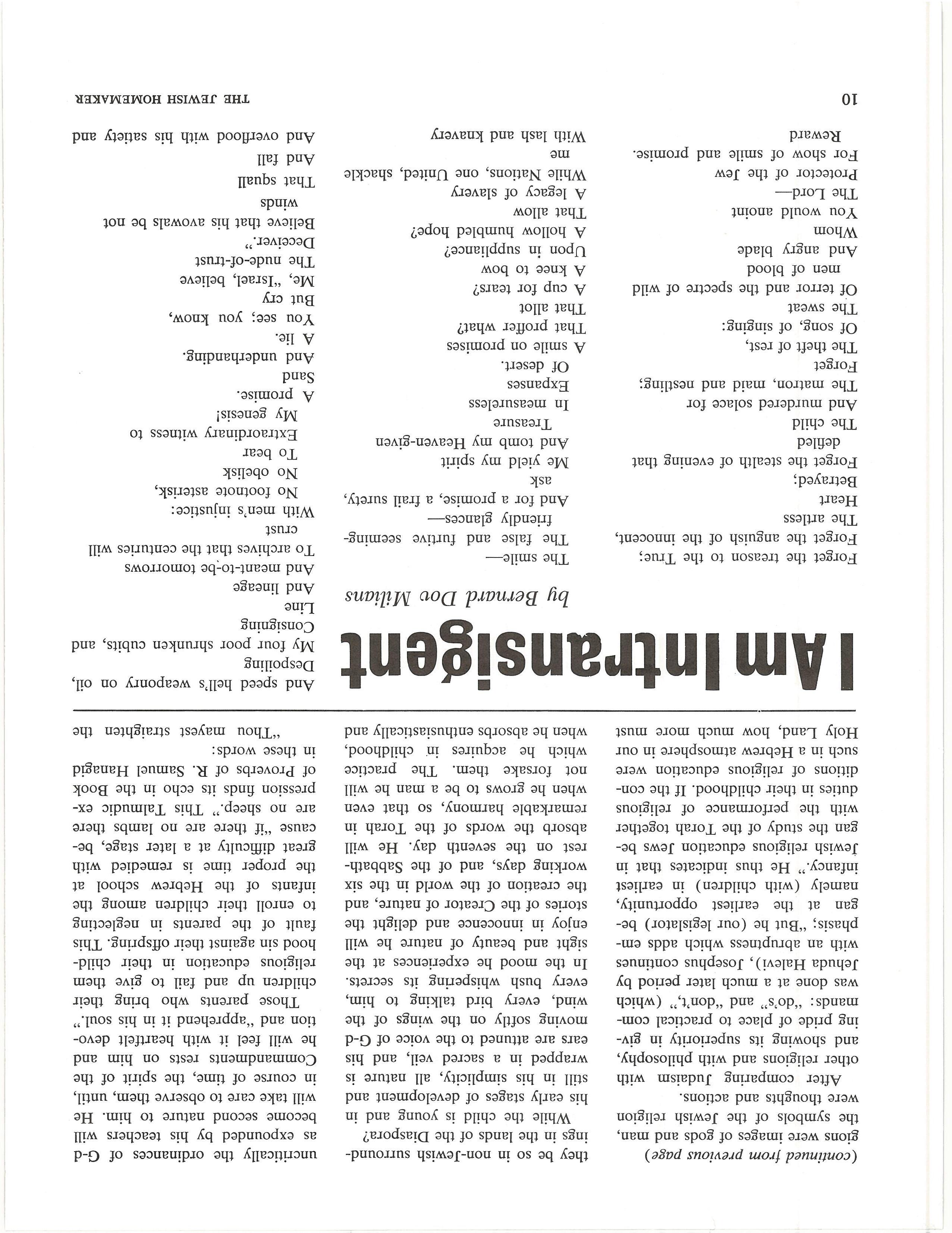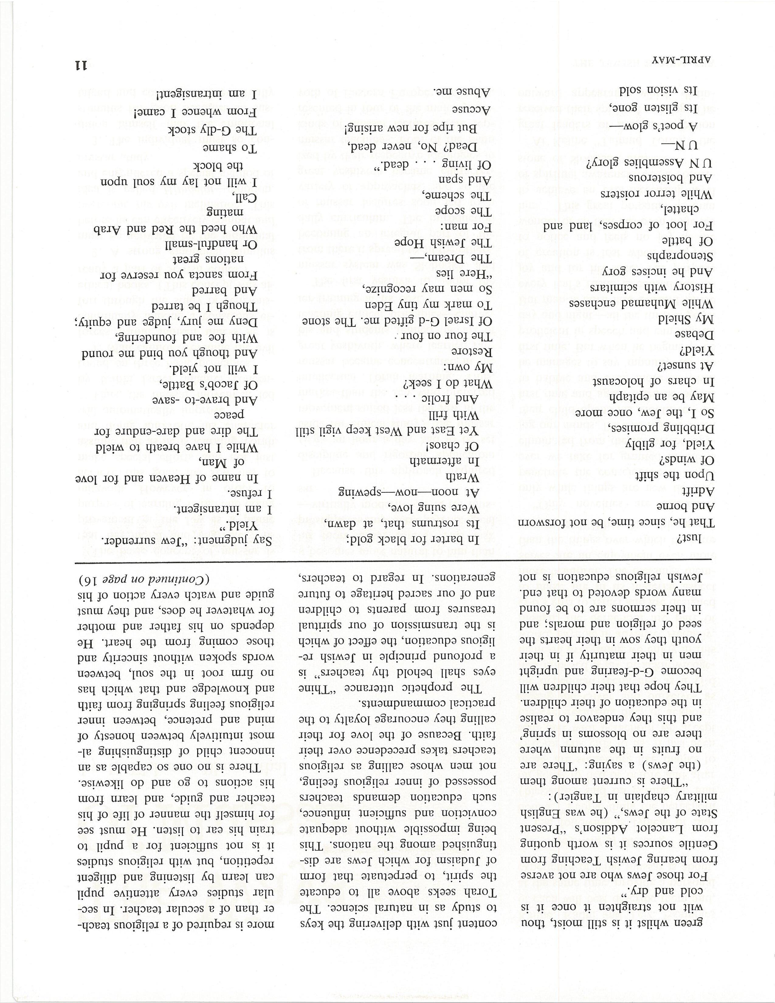 Indeed if peace takes hold, we will join together with thousands upon thousands of sons and daughters of Jacob in being grateful. But we are not certain of the consequences of peace and fear them. We are aware of the comforts of Bashan and do not rest easy. We have seen the penalties of affluence and the rewards of exi gency. We have seen communities gal vanized to action in crisis and watched their unity dissolve when the crucial hours have passed to forgetting. We have seen the confluence of heart and purpose when the enemy is baying at our heels, and have noted how quickly bonds fall asunder when the enemy slinks away to lick his wounds, only to be bound again when the enemy has regrouped his forces. We have seen Jewish communities blend into the countryside and lose their personality and their identity; seen our sons and daughters assume the coloration of their neighbors; watched them grow fat, foolish and every day more igno rant of what was, what is and what was meant to be. We have seen how little those who should be the leaders really care, while our young blend more surely into the countryside and are completely lost to us. Blended, lost forever in far greater numbers than any toll of battle. Each day thousands more. Countless thousands fallen, wal lowing, lost in a sea of nothing.