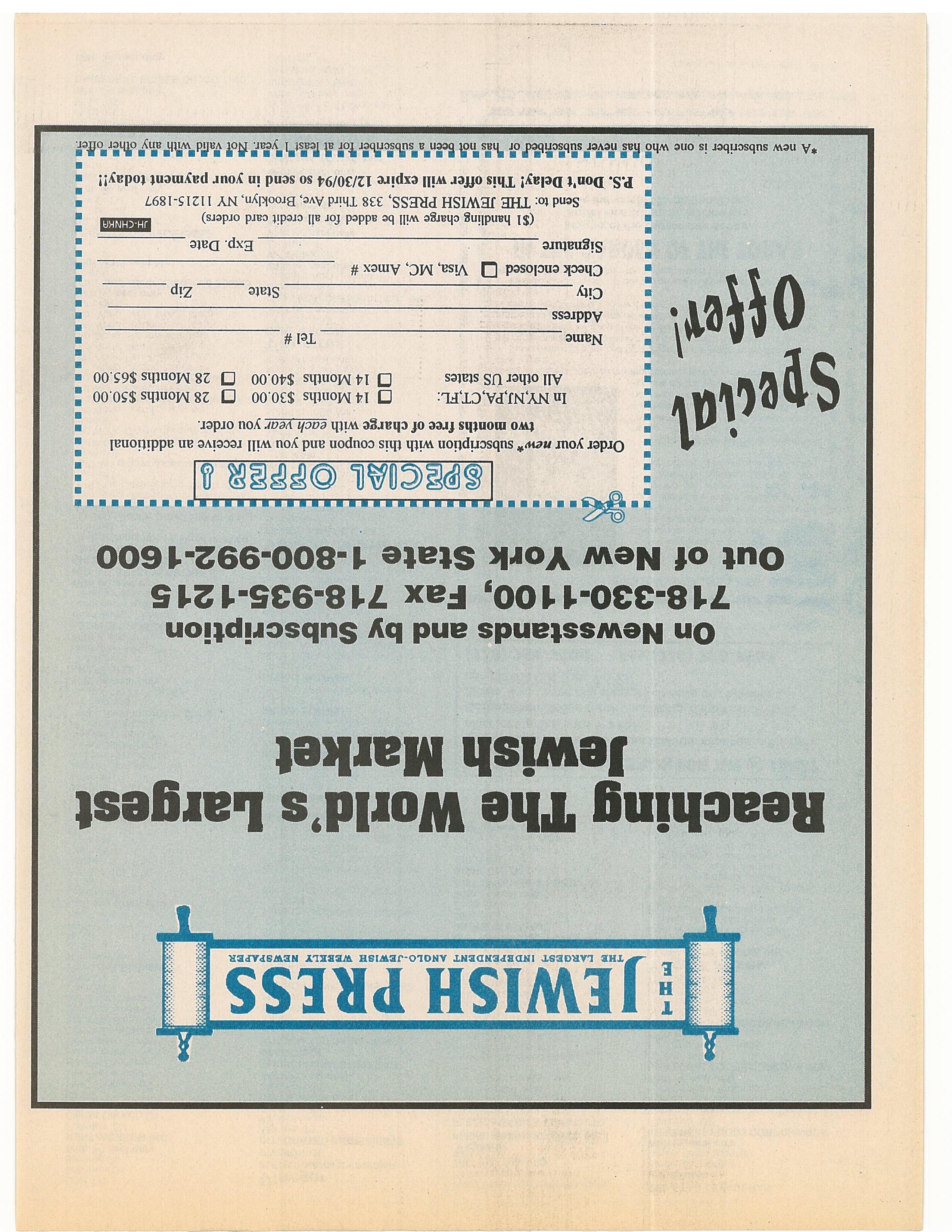~JWIS RES THE LARGEST IEDEPENDENT ANGLO-JEWISH WEEKLY NEWSPAPER Reaching The Wo id’s Largest J wish M rket On Newsstands and by Subscription 718-330-1100, Fax 718-935-1215 Out of New York State 1-800-992 1600 Check enclosed ~ Visa, MC, Amex # Signature Exp. Date ($1 handling chalEe will be added for all credit card orders) Send to: THE JEWISH PRESS, 338 Third Aye, Brooklyn, NY 11215-1897 P.S. Don’t Delay! This offer will expire 12/30/94 so send in your payment today!! a a a a a a a a a a a S a isa..... Order your new* subscription with this coupon and you will receive an additional two months free ofcharge with each year you order. In NY,NJ,PA,CT~FL: All other US states 0 f~ 14 Months $30.00 ~ 28 Months $50.00 I!I 14 Months $40.00 ~ 28 Months $65.00 Name Tel # Address City a a a B a a a a a a a I State I . I a a a a a a I B I I a a I a a a I I I ala. •m..mp..a •~a I • .••a •i~a .aa I. new subscnber is one who as never a bscn or nsa noi osan a su scnner or i s i year. ot vatid wi h any o er C) er.