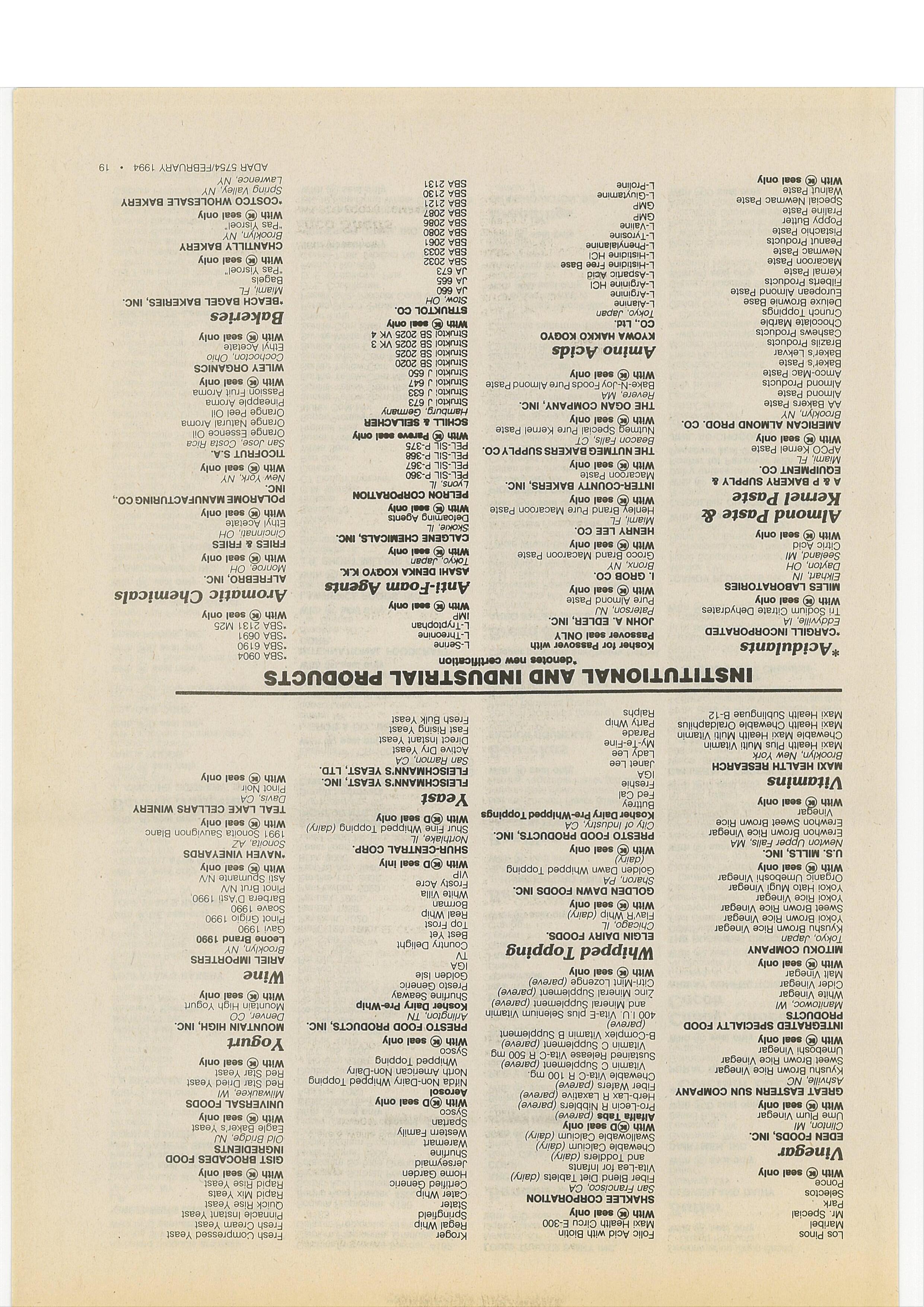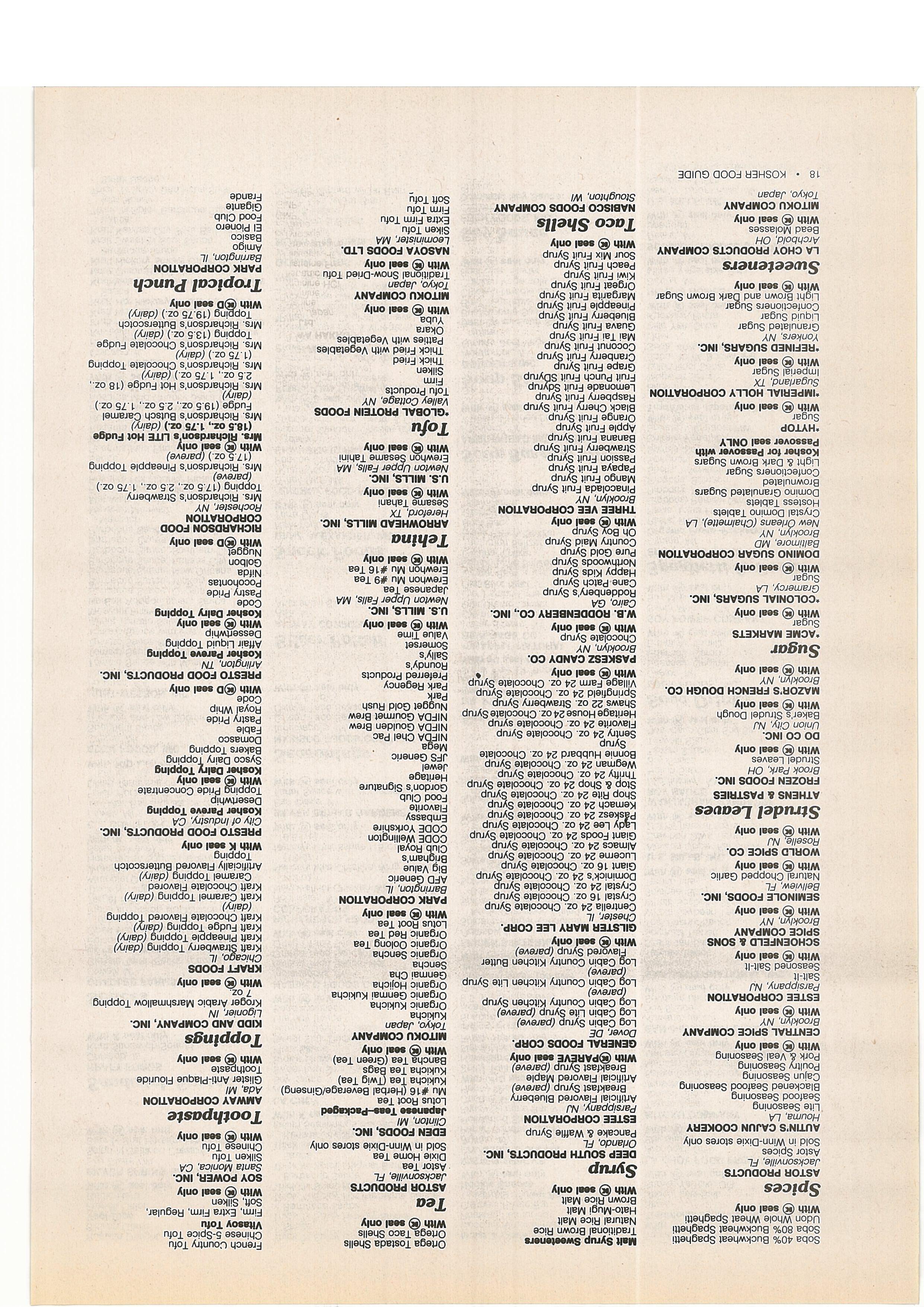 COMPANIA INDIJS’TRIAL Soybean Salad Oil AMERICAN F~OD INDUSTRIES GROW COMPANY DEL LUKUS s.A. Industrial Wesson Oil Watsonvilla, CA Hackensack, NJ Larache, Morocco Canola Oil Cucamonga, CA Chromium Yeast Spray Dried Tomato Powder Corn Oil White Vinegar Selenium Yeast Winterized Soybean Oil WIth ® seal only wIth® seal only OBI PEK11N AG Sunflower Oil INTEGRATED SPECIALTY UNIVERSALFOODSCORPORATION Bischofszell, Switzerland 22 Oil FOOD PRODUCTS Baltimore. MD D,ied FruIt Powder Midas Manitowoc, WI Bakers Compressed Yeast Products Pineapple Key Mon,oe, Ml Active Dried Yeast Apple Quiz and Royal Quiz WhIte Vinegar Inactive Yeast Products Apricot 77 Oil Cider Vinegar With ® seal only Pear Formula 101 Corn Sugar Vinegar UNIVERSALFOODSCORPORATION Fig Veltex Malt Vinegar Juneau, wi Grapefruit Peanut Oil With ® 0.11)? Autolized Yeast Extracts Guava Olive Oil Rose Hip MFB FLEISCHMANN’S YEAST, INC. WIth® seal only Bilberry Super Wesson San Ramon, CA UNIVERSALFOODSCORPORATION Kiwi Lo Melt BENCHMATE-VInegsr Milwaukee, WI M~lon Crystal AP~J~Ig5~~er Vinegar 50 GraIn, Red Star Dried Yeast Orange Wespour Red Star Yeast Papaya Wesgold Apple CRier Vinegar 60 Grain, witt. ® seal only Fãssion Fruit Wesson Cottonseed Oil 7106040 I~lum Wesaon Pan Coating WhIte Distilled Vinegar 100 Grain, Tangerine With ® seal only 7100070 l’ogi’t Mixes Mango Wlilt~Distilled Vinegar 120 Grain, ELGIN DAIRY FOODS, INC. Morello Cherry KRAFT, INC. 7100080