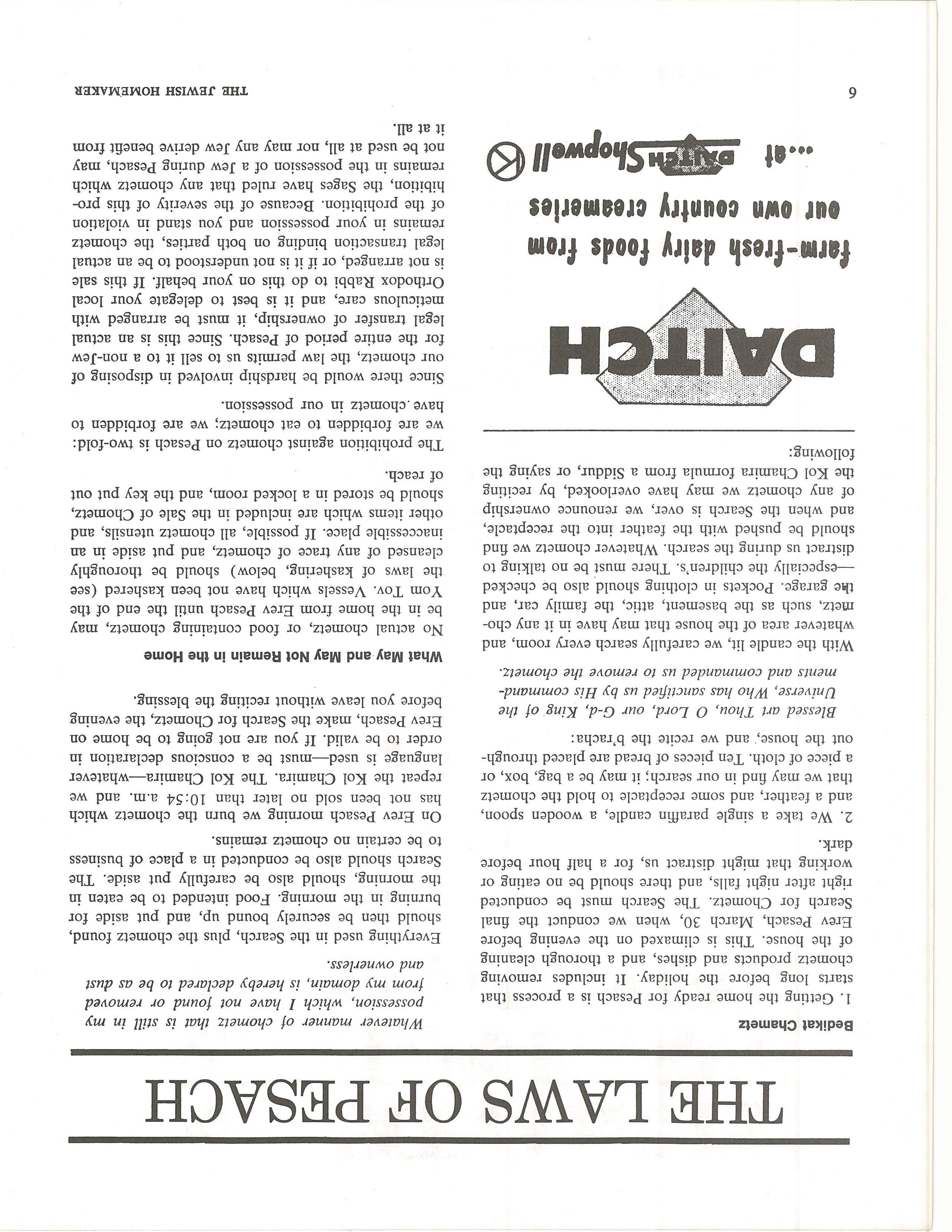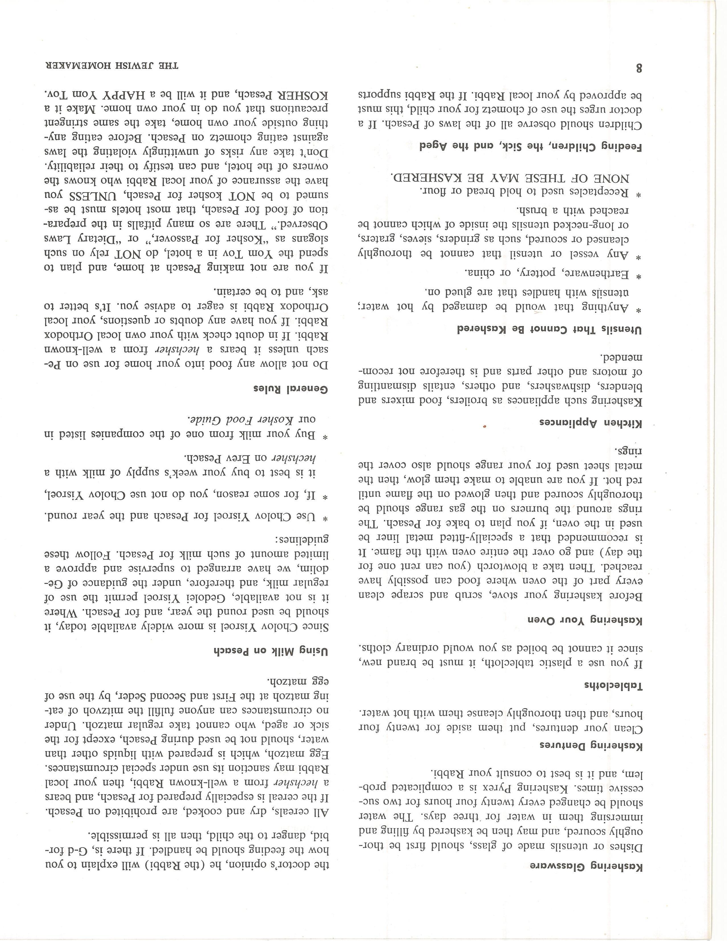 Bedikat Chometz on the evening of March 30 (Sunday night). What may and may not remain in the house. The laws of kashering. Feeding the infant and the infirm. General rules for Passover.