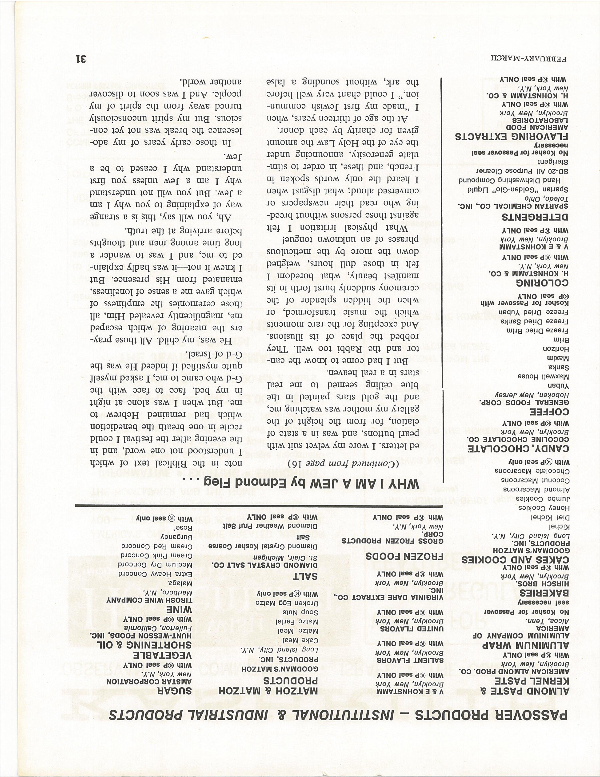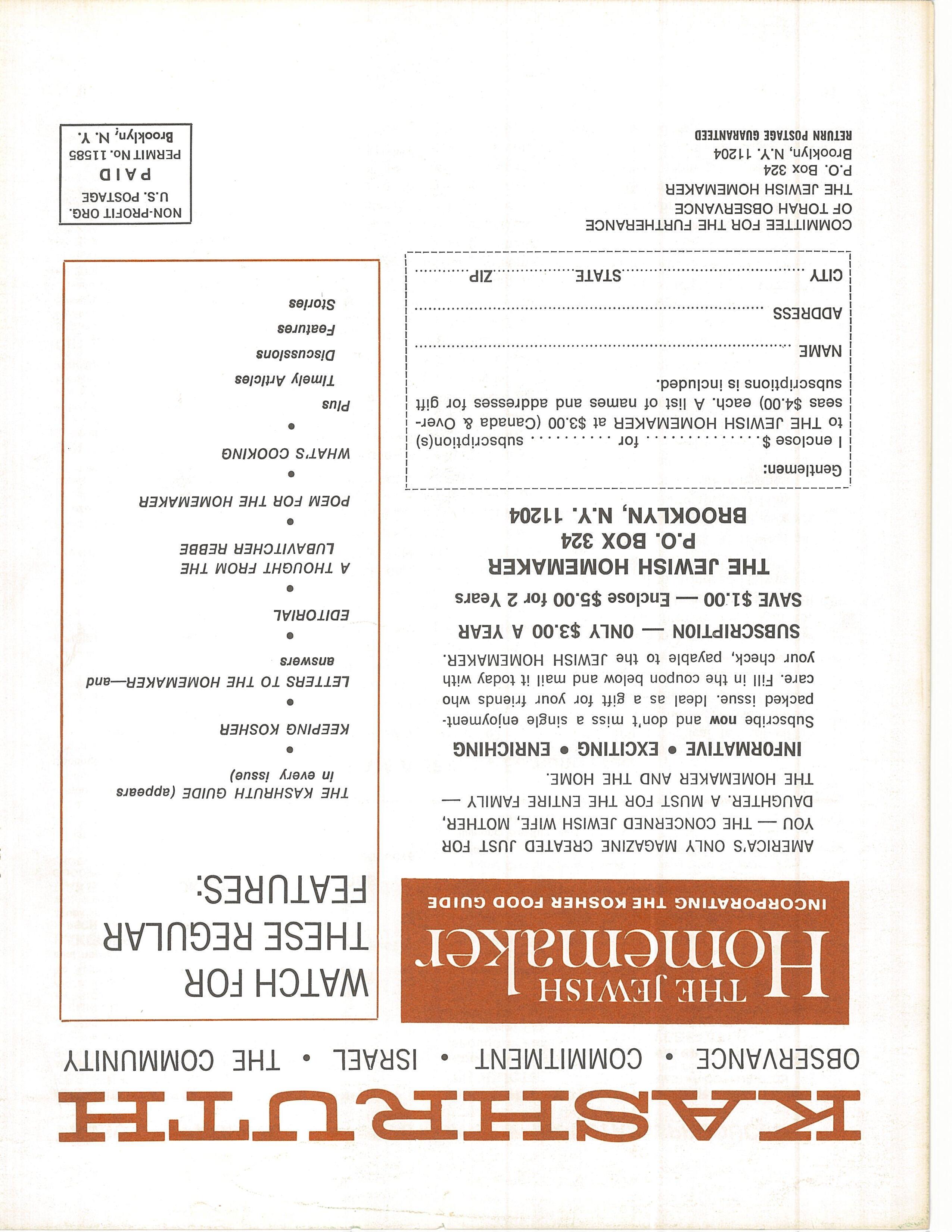 AMERICA’S ONLY MAGAZINE CREATED JUST FOR YOU THE CONCERNED JEWISH WiFE, MOTHER, DAUGHTER. A MUST FOR THE ENTIRE FAMILY THE KASHRUTH GUIDE (appears THE HOMEMAKER AND THE HOME. In every issue)