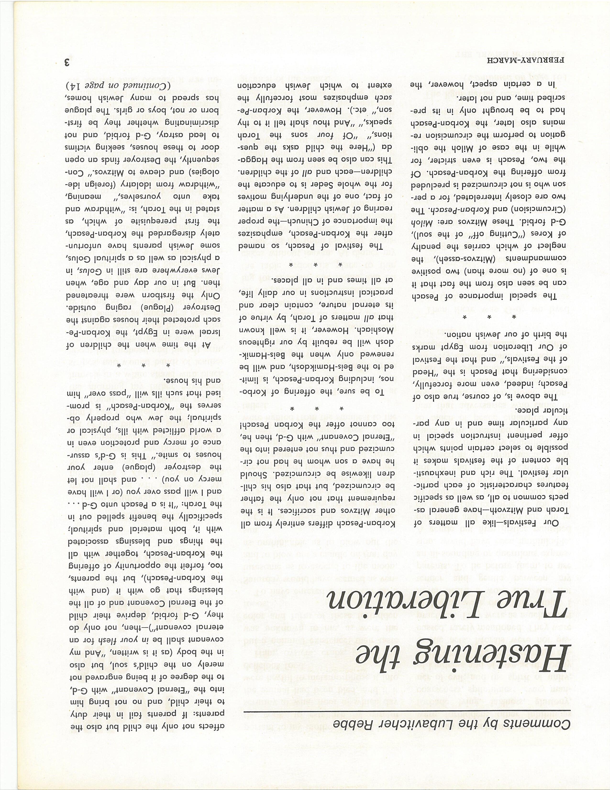 affects not only the child but also the parents: If parents fail in their duty to their child, and no not bring him into the “Eternal Covenant” with G-d, to the degree of it being engraved not merely on the child’s soui, but also in the body (as it is written, “And my covenant shall be in your flesh for an eternal covenant”)—then, not only do they, G-d forbid, deprive their child of the Eternal Covenant and of all the blessings that go with it (and with the Korban-Pesach), but the parents, too, forfeit the opportunity of offering the Korban-Pesach, together with all the things and blessings associated with it, both material and spiritual; specifically the benefit spelled out in the Torah: “It is a Pesach unto G-d and I will pass over you (or I will have mercy on you) and shall not let the destroyer (plague) enter your houses to smite.” This is G-d’s assur ance of mercy and protection even in a world afflicted with ills, physical or spiritual; the Jew who properly ob serves the “Korban-Pesach” is prom ised that such ills will “pass over” him and his house.