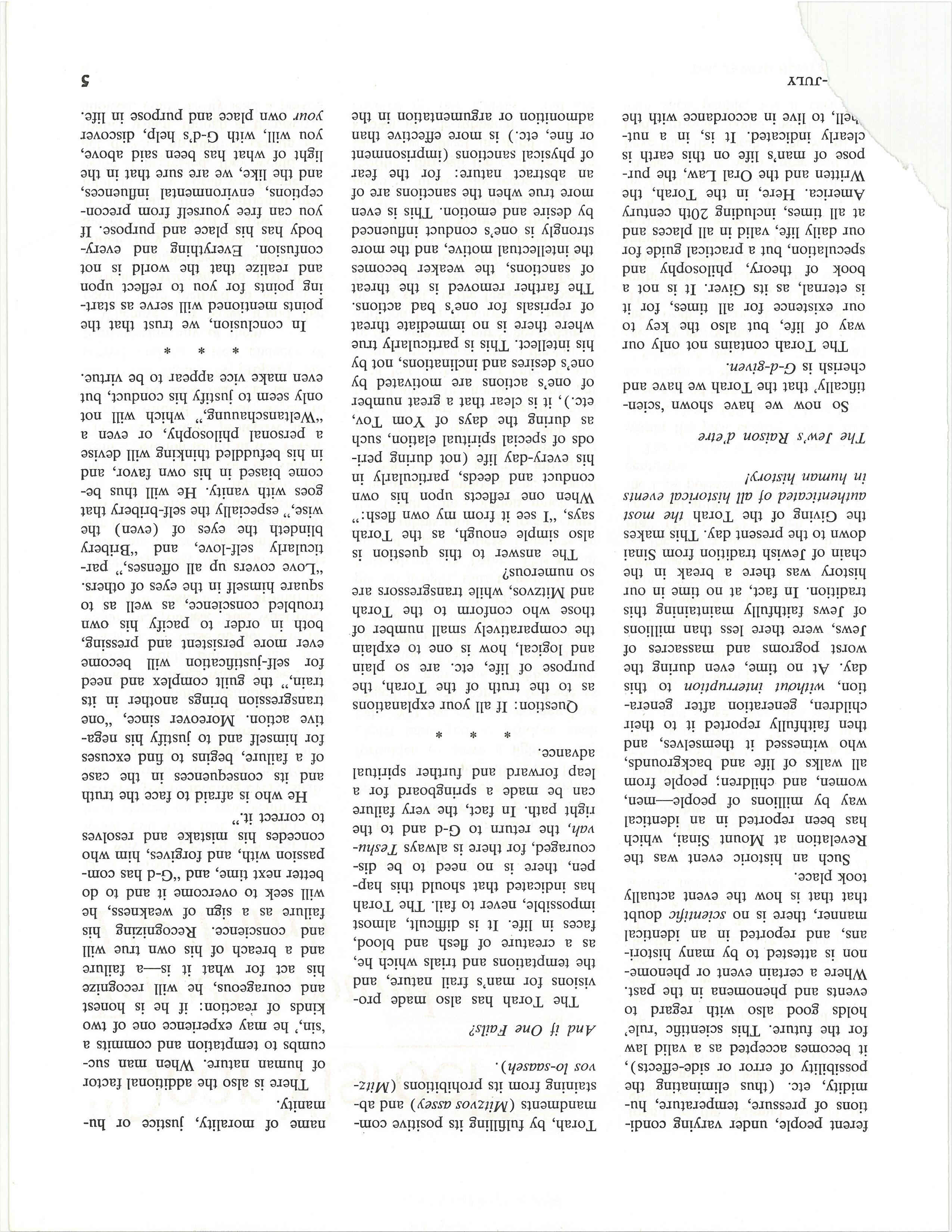 The Torah contains not only our way of life, but also the key to our existence for all times, for it is eternal, as its Giver. It is not a book of theory, philosophy and speculati01~~ but a practical guide for our daily life, valid in all places and at all times, including 20th century America. Here, in the Torah, the Written and the Oral Law, the pur S~ pose of man’s life on this earth is ~‘\clearlY indicated. It is, in a nuthell, to live in accordance with the