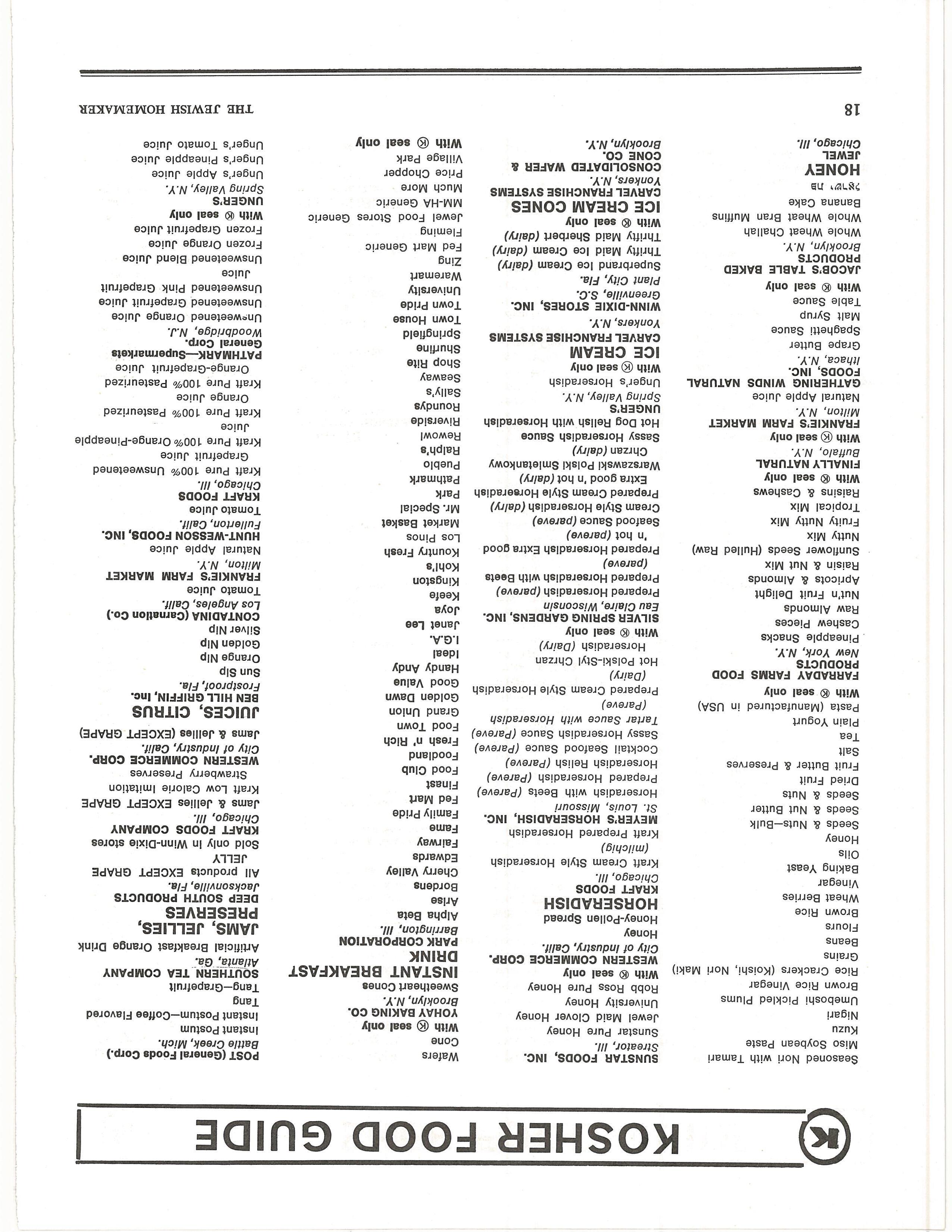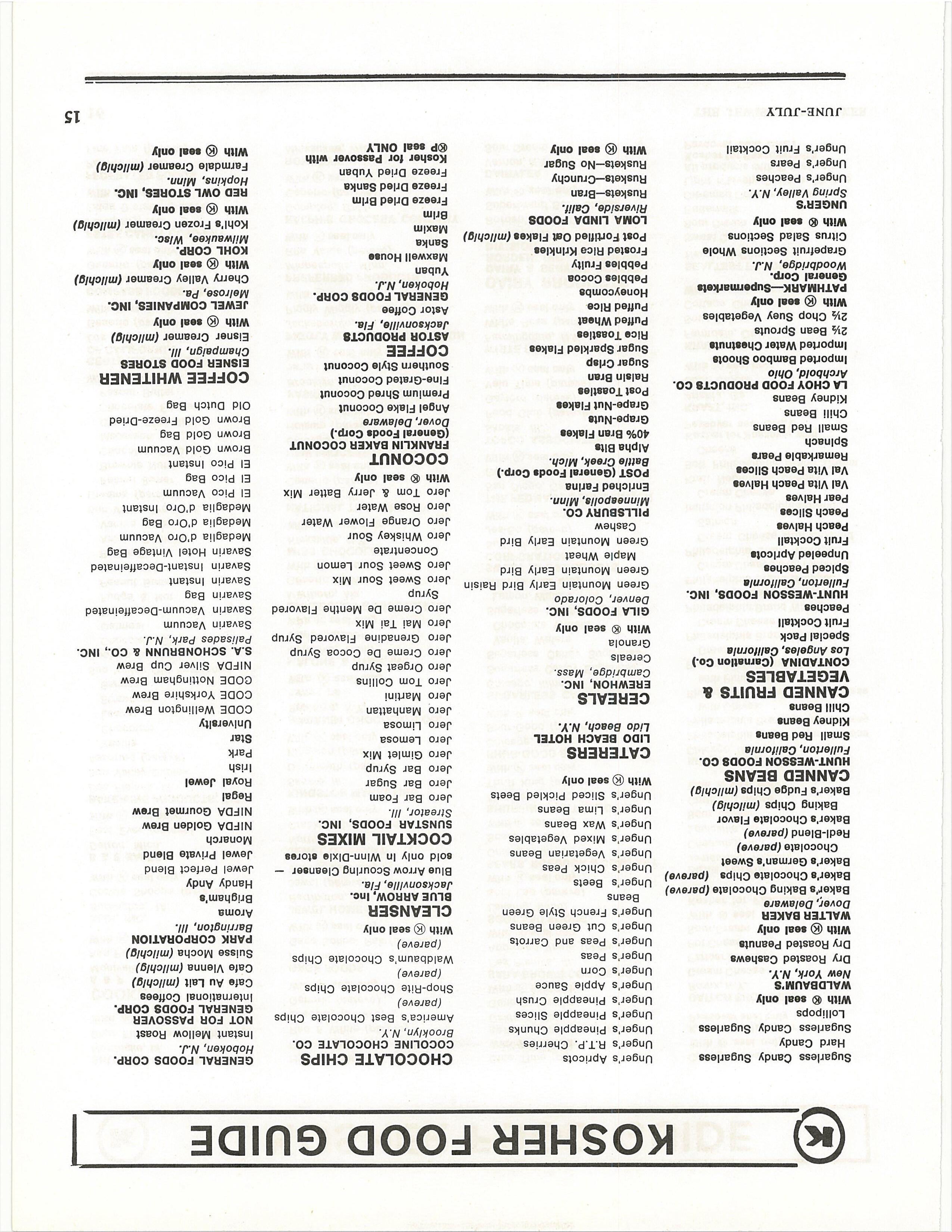 LA CHOY FOOD PRODUCTS CO. Kraft Sdls. Red Raspberry VITAMINS Autolized Yeast Extracts Archbold, Ohio Flavoring for Yogurt CROSBY & CO. With ® seal only Number 10 Chop Suey Kraft Lemon Flavoring for Yogurt Solana Beach, Ca/il. WINE Number 10 Bean Sprouts Kraft Peach Meiba Flavoring Vitamin B-12 TIROSH WINE COMPANY Number 10 Fancy Mixed Chinese For Yogurt DIAMOND SHAMROCK CO. Marlboro, N.Y. Vegetables Orange-Pineapple Newark, N.J. Extra Heavy Concord With® seal only With® seal only Medium Dry Concorn VITAMINS Inc. VEGETABLE VINEGAR Chicago, ii,. Cream Pink Concord SHORTENINGS & OILS KRAFT FOODS With® seal only Cream Red Concord CAPITAL CITY PRODUCTS CO. Chicago, lii. YEAST Burgandy Columbus, Ohio Kraft 100 Grain Vinegar AMBER LABORATORIES Rose WIth® seal only Kraft 50 Grain Vinegar Milwaukee, Wisconsin With ® seal oni HUNT-WESSON FOODS, INC. Fullerton, Calif. 22 Oil Mldeo Key Quiz Gamma N t - - i~~Zj) Palm OIl ___________ MFB I I Super We on A ~ ~ AMERICA’S FRESHEST ICE CREAM Lo.MeIt Crystal Wesson OIl 77011 p~. • U Veltex Super Quik-Blend Wespour Golden Be. Wesbiend r • iii Formula 101 HW-2 / Low Fat Frozen Yogurt Scoco Plus Wesgoid With® seal only 0 KORBRO OIL CORP. ‘fhinny.fhin® Richmond Hills, N.Y. Soybean OIl Dietary Frozen Dessert Corn Oil Safflower OIl Cottonseed OIl All Certified KOSHER by Peanut OIl Sunflower Oil With® seal only O.K. LABORATORIES YOGURT FLAVORING KRAFT FOODS Chicago, iii. Kraft Apricot Flavoring for Yogurt J~ ~ ~_~_ Kraft Blueberry Flavoring forYogurt 4 Kraft Raspberry FlavorIng for Yogurt Kraft Strawberry Flavoring for Yogurt Kraft Peach Flavoring for Yogurt All Ca4~4’ee® products are made FRESH, every day, Kraft Lime Flavoring for Yogurt in the CARVEL stores where they are sold. Kraft Pineapple Flavoring for Yogurt Kraft Blk. Cherry Flavoring for Yogurt WOULD YOU LIKE TO OWN A Cahvee® STORE? Kraft Mand. Orange Flavoring for Carvel Corporation is expanding with new stores opening every day We need Yogurt qualified families who would like to own and operate a CARVEL Ice Cream Store For information, call or write Kraft Orange Pineapple Falvor- CORPORATION Yonkers, N.Y. 10701 (914) 96 -7200 lng for Yogurt 27 JUNE-JULY