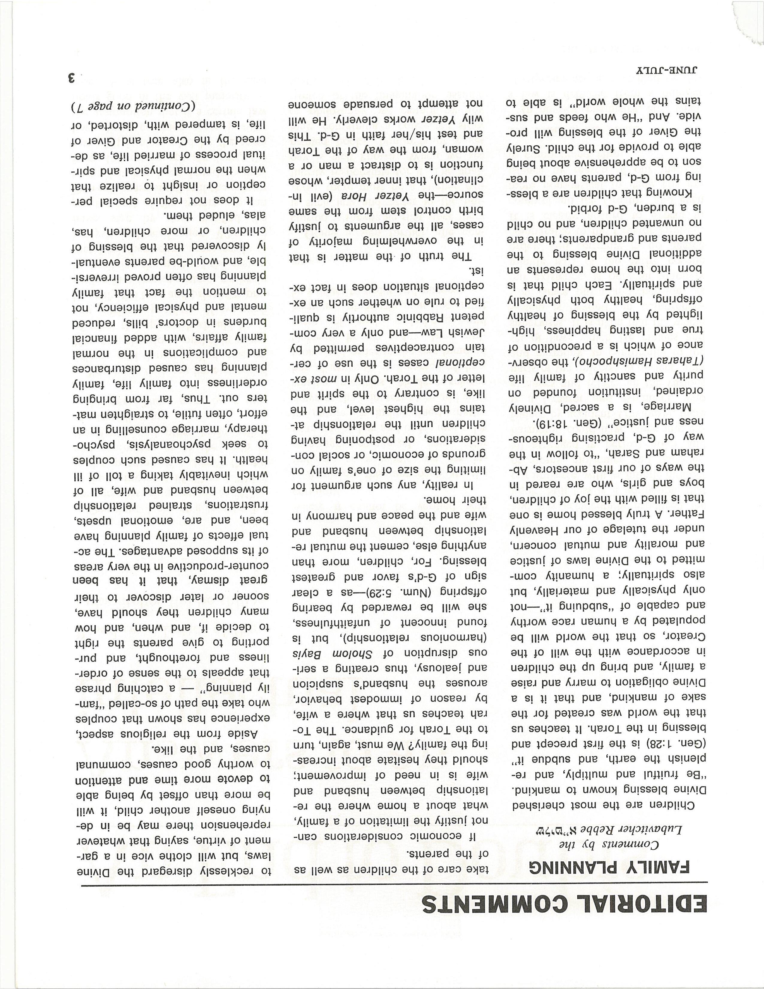 In reality, any such argument for limiting the size of one’s family on grounds of economic, or social con siderations, or postponing having children until the relationship at tains the highest level, and the like, is contrary to the spirit and letter of the Torah. Only in most ex ceptional cases is the use of cer tain contraceptives permitted by Jewish Law—and only a very com petent Rabbinic authortiy is quali fied to rule on whether such an ex ceptional situation does in fact ex ist.