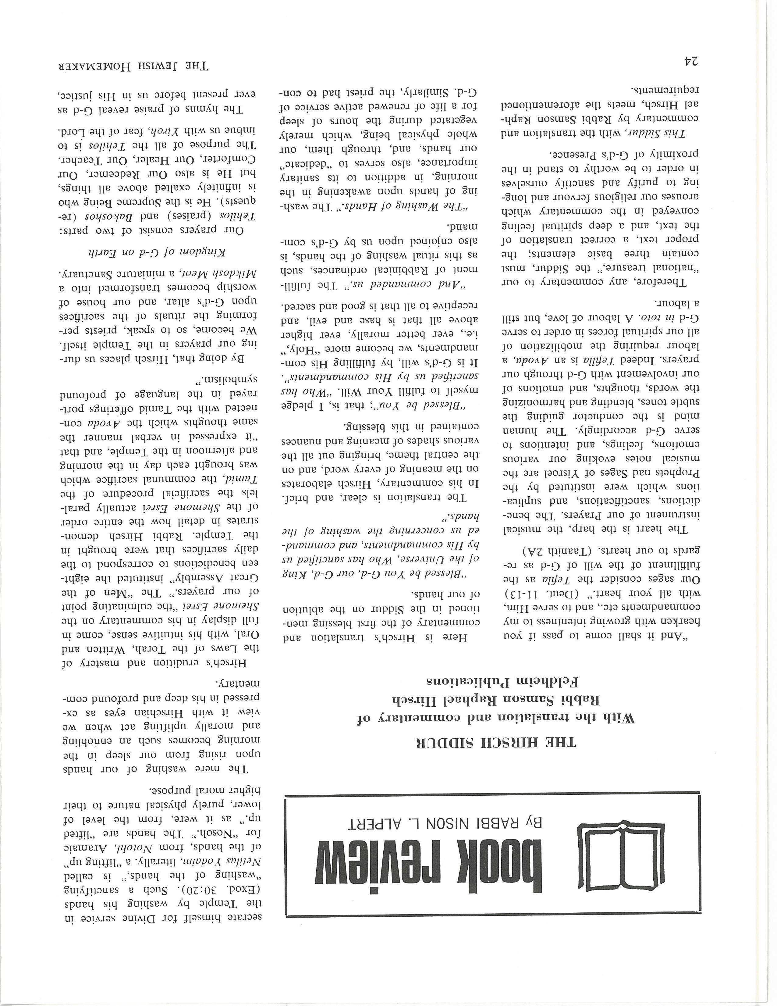 The Samson Raphael Hirsch Pub lications Society and the Feldheim Publishers of Jerusalem New York are to be commended for making available to us Rabbi Hirsch’s com mentary on our Siddur in clear, lucid English enabling us to view our pray ers with his profound and deep under standing of them. This hitherto hidden treasure should adorn every Jewish home.