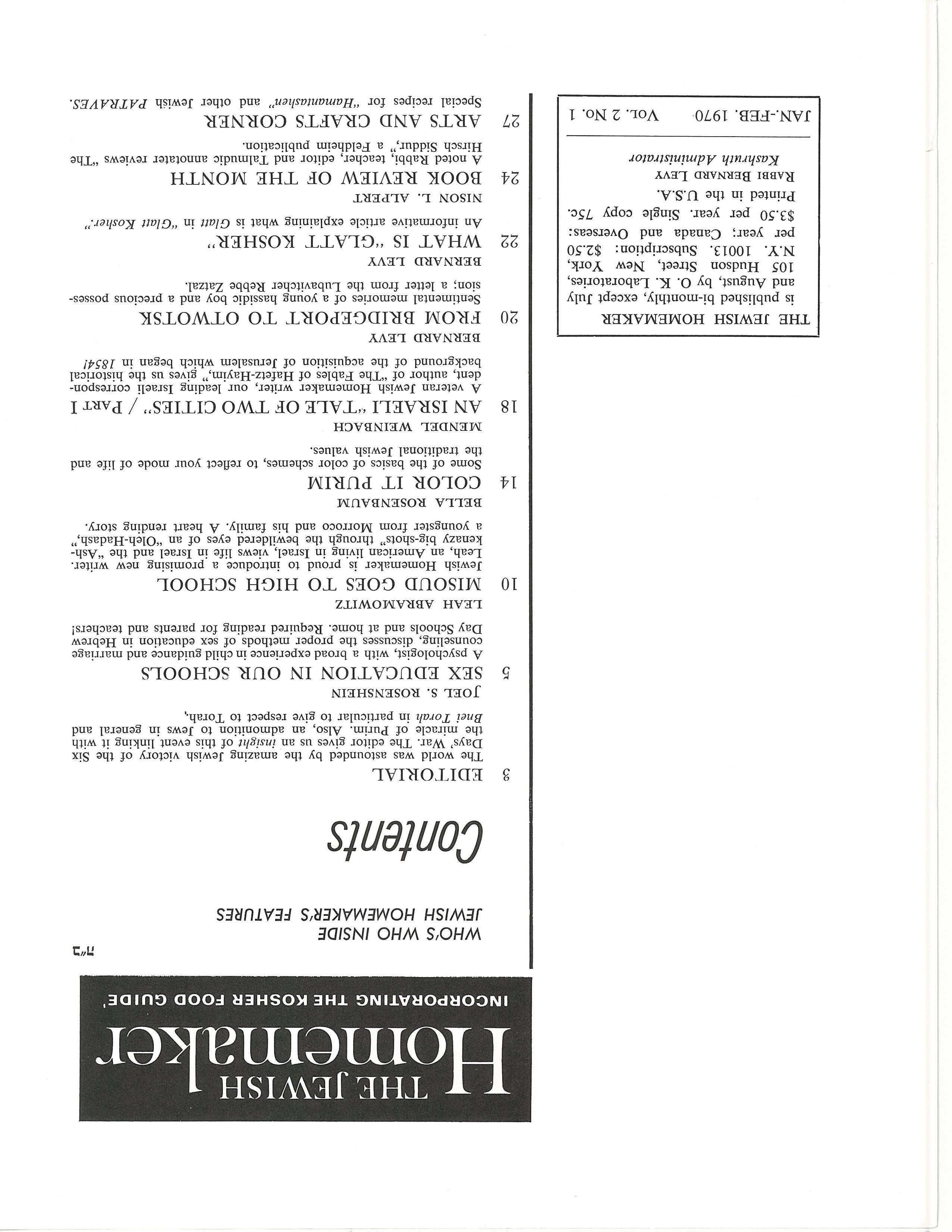 Some back copies of Jewish Homemaker are available at 5 copies for $6.00. When ordering, please specify the issues desired and enclose payment.